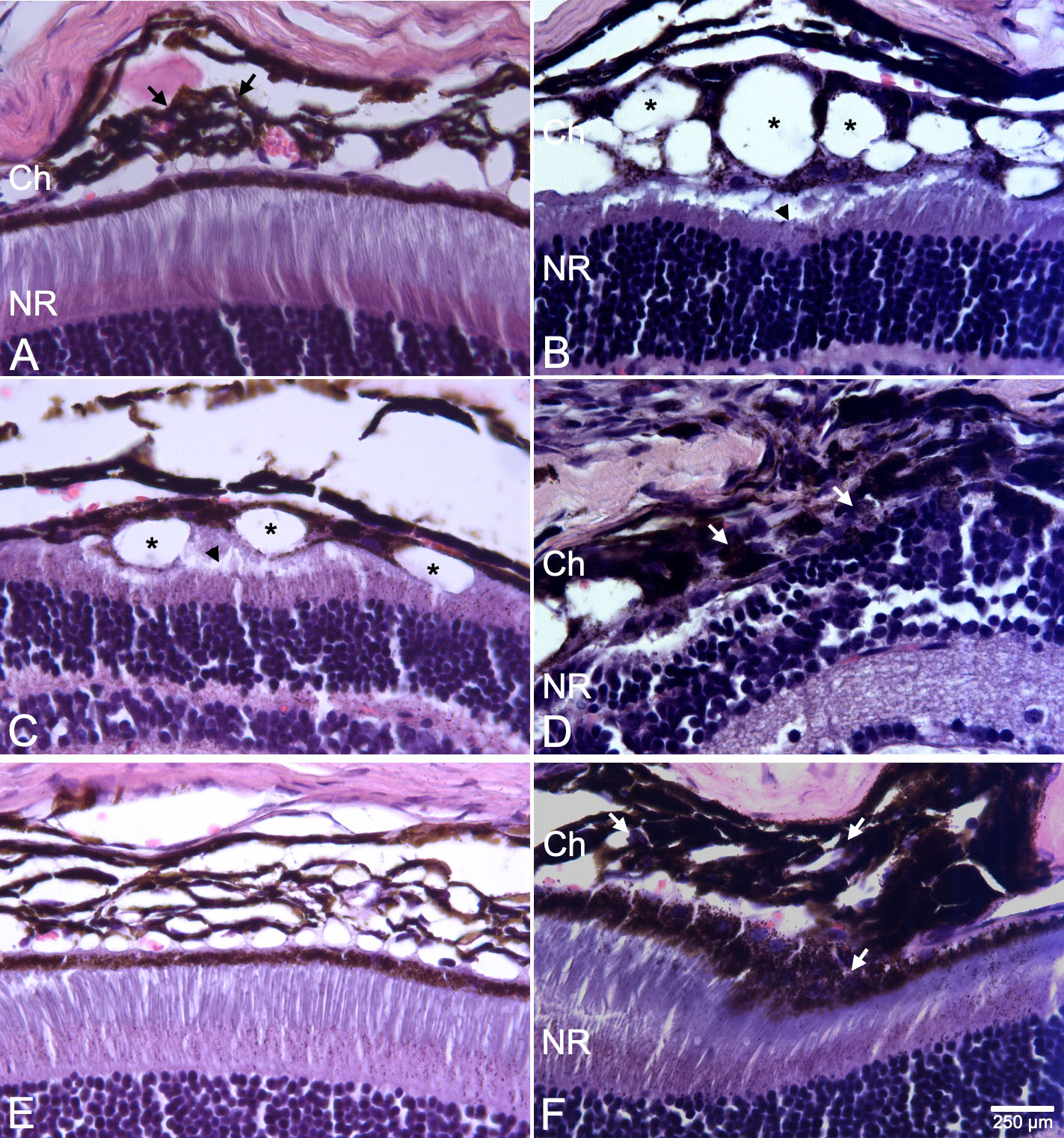 and (D) PEG-injected eyes revealed marked retinal degeneration and total RPE/choroid disruption (arrows). At 21 days, (E) PBS-injected eyes showed that the retina/choroid structures were preserved, while (F) PEG-injected eyes had RPE clumps and pigment cell migration (arrows). Ch: choroid; NR: neuroretina; PEG: polyethylene glycol.