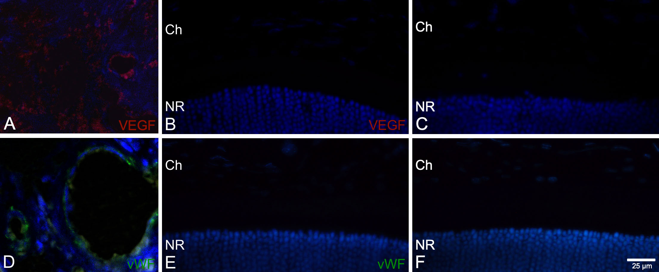 Figure 5. Vascular endothelial growth factor (VEFG) and von Willebrand factor (vWF) immunofluorescence in retina/choroid sections from