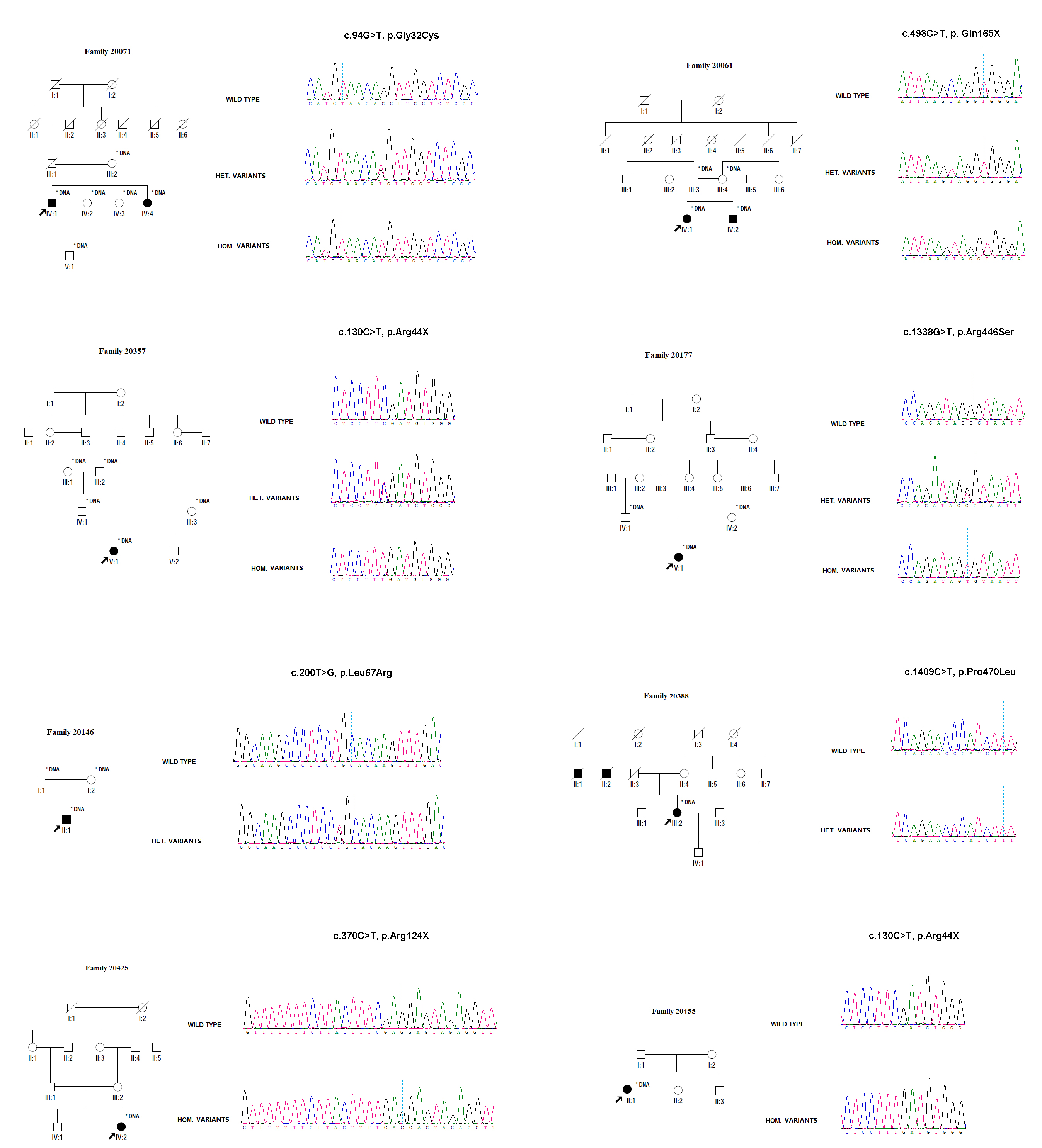 symbols: affected patients. Individuals genotyped with available DNA are marked with asterisks. Probands are pointed out by
