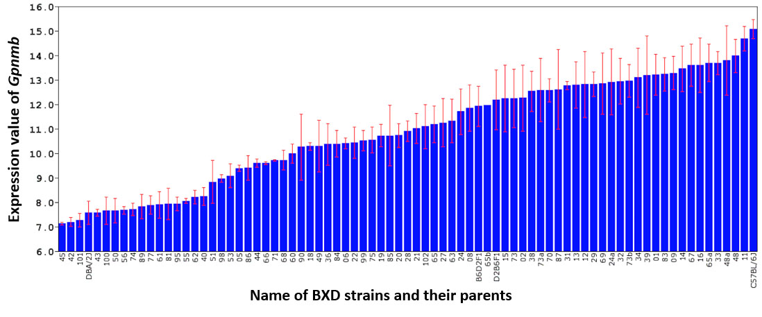 Figure 1. Expression level of Gpnmb in the retina of the B6 and D2 parental strains, F1 hybrids, and 75 BXD strains. The expression values for each sample were