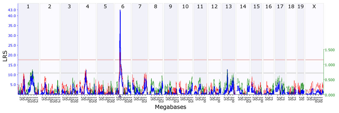 Figure 2. Genetic mapping of Gpnmb. A statistically significant expression quantitative trait locus (eQTL) was found at chromosome 6, which is within 1 Mb of
