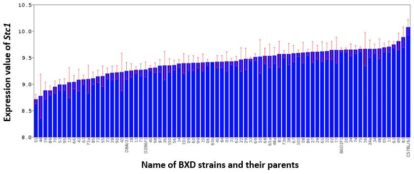 Figure 5. Expression level of Stc1 in the retina of the B6 and D2 parental strains, F1 hybrids, and 75 BXD strains. The expression value for each sample was