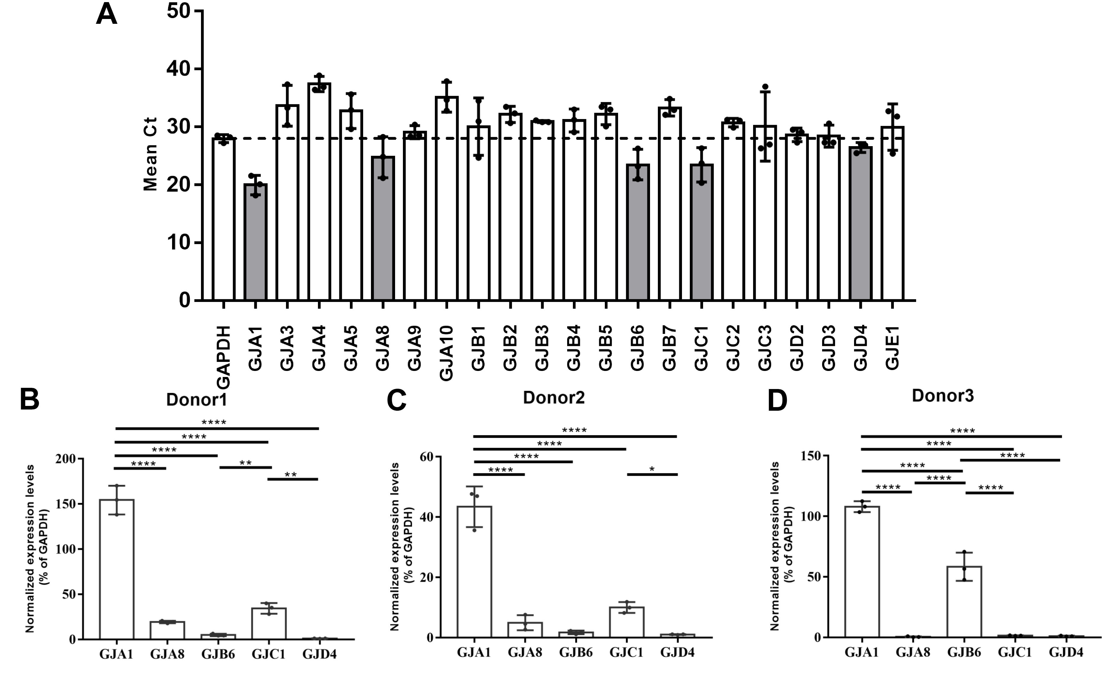 Ct values for the GJA1, GJA8, GJB6, GJC1, and GJD4 gene expression levels were compared with that of GAPDH. B–D: Transcriptional levels of the GJA1, GJA8, GJB6, GJC1, and GJD4 genes in donors 1 to 3 were normalized to the mRNA level of GAPDH. The GJA1 gene, also known as connexin 43, showed the highest expression level. Three independent experiments were performed (n=3).