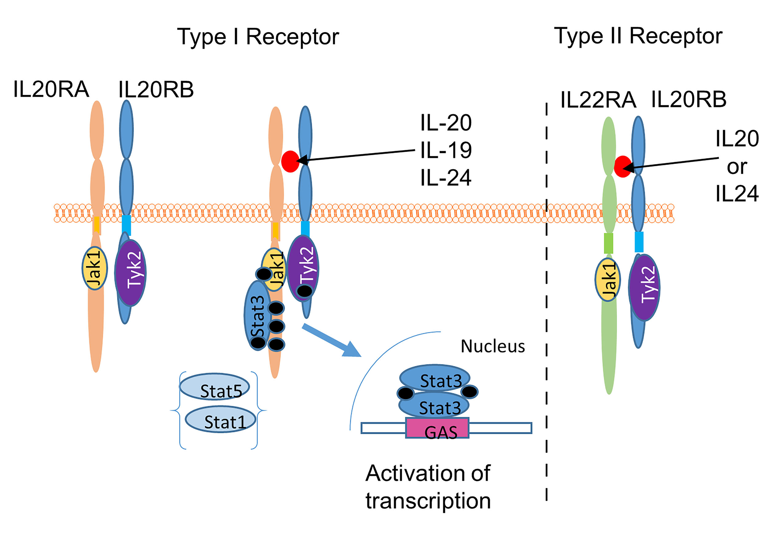 Figure 1. Schematic of interleukin-20 receptor complex before and after activation by IL-20, -19, or -24. The type I receptor is composed
