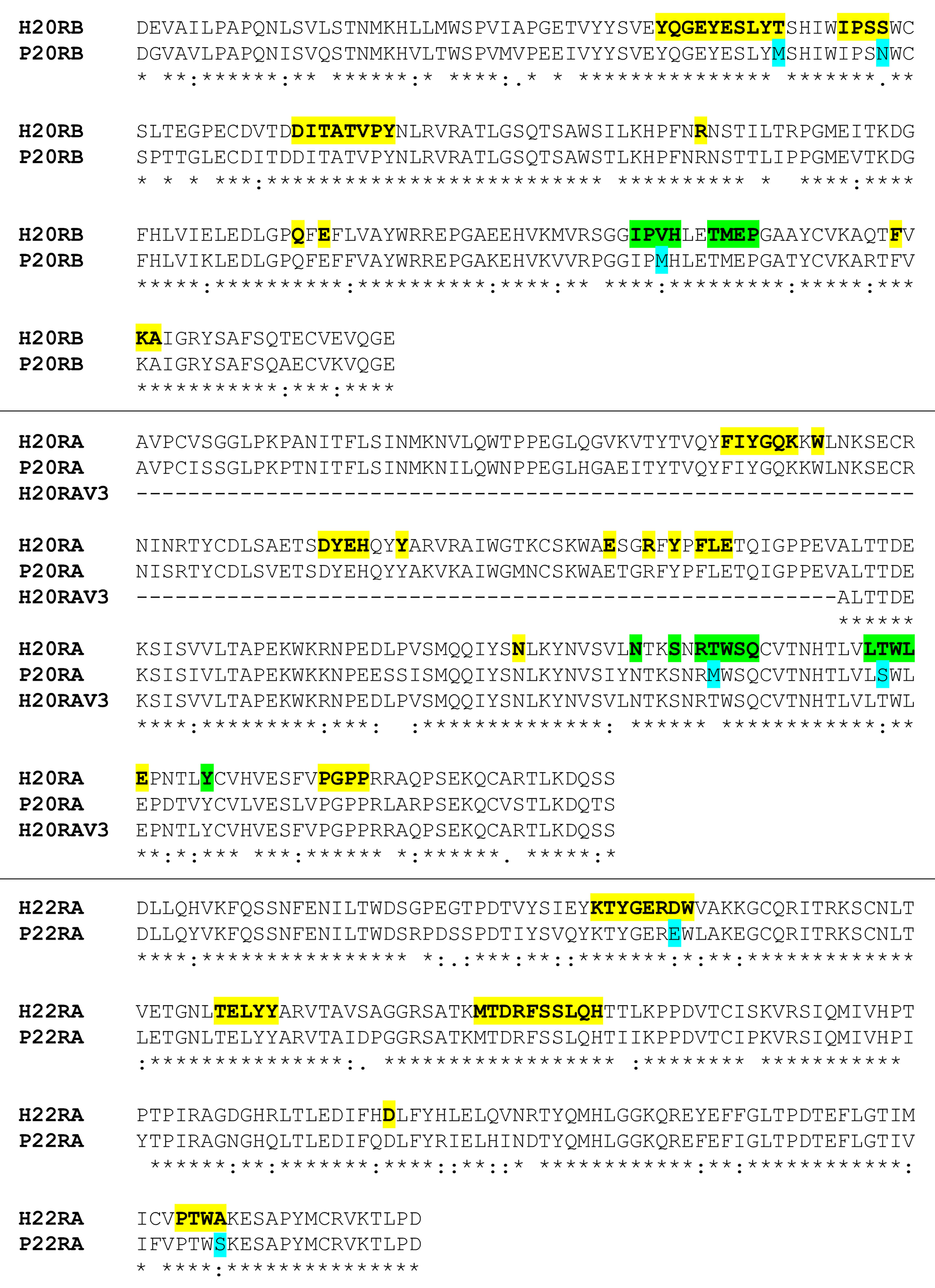 Figure 8. Amino acid sequence alignments of human and porcine IL-20 receptors. Receptor-cytokine (bold/yellow) and receptor-receptor