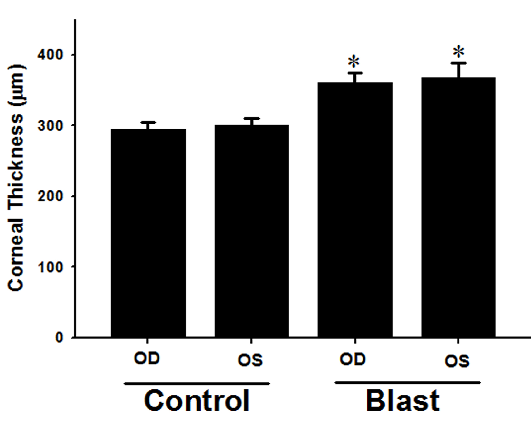 Figure 3. Corneal thickness measurement by confocal microscopy. OD: Right eye; OS: left eye. Scan at 48 h post-blast exposure. *Control