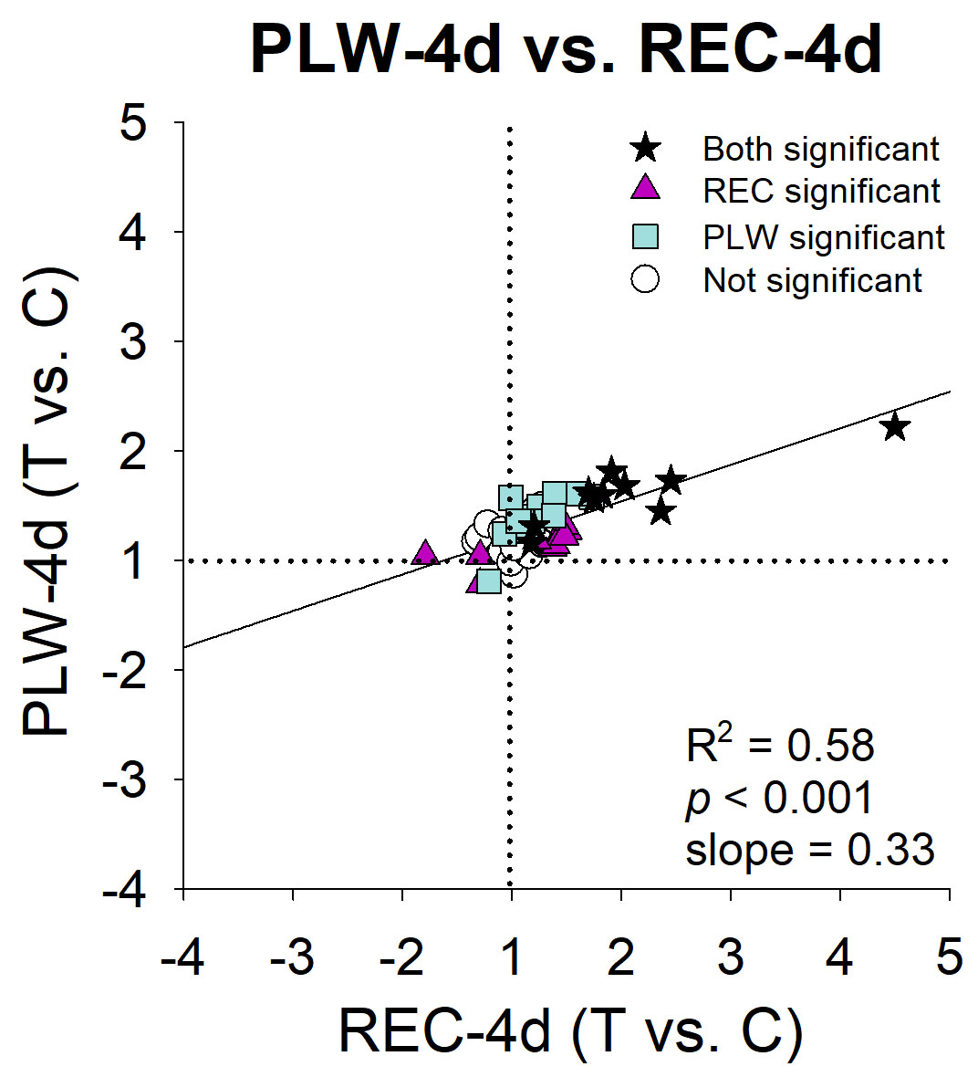 Figure 8. Comparison of the treated eye versus control eye gene expression differences in PLW and REC: PLW-4d (