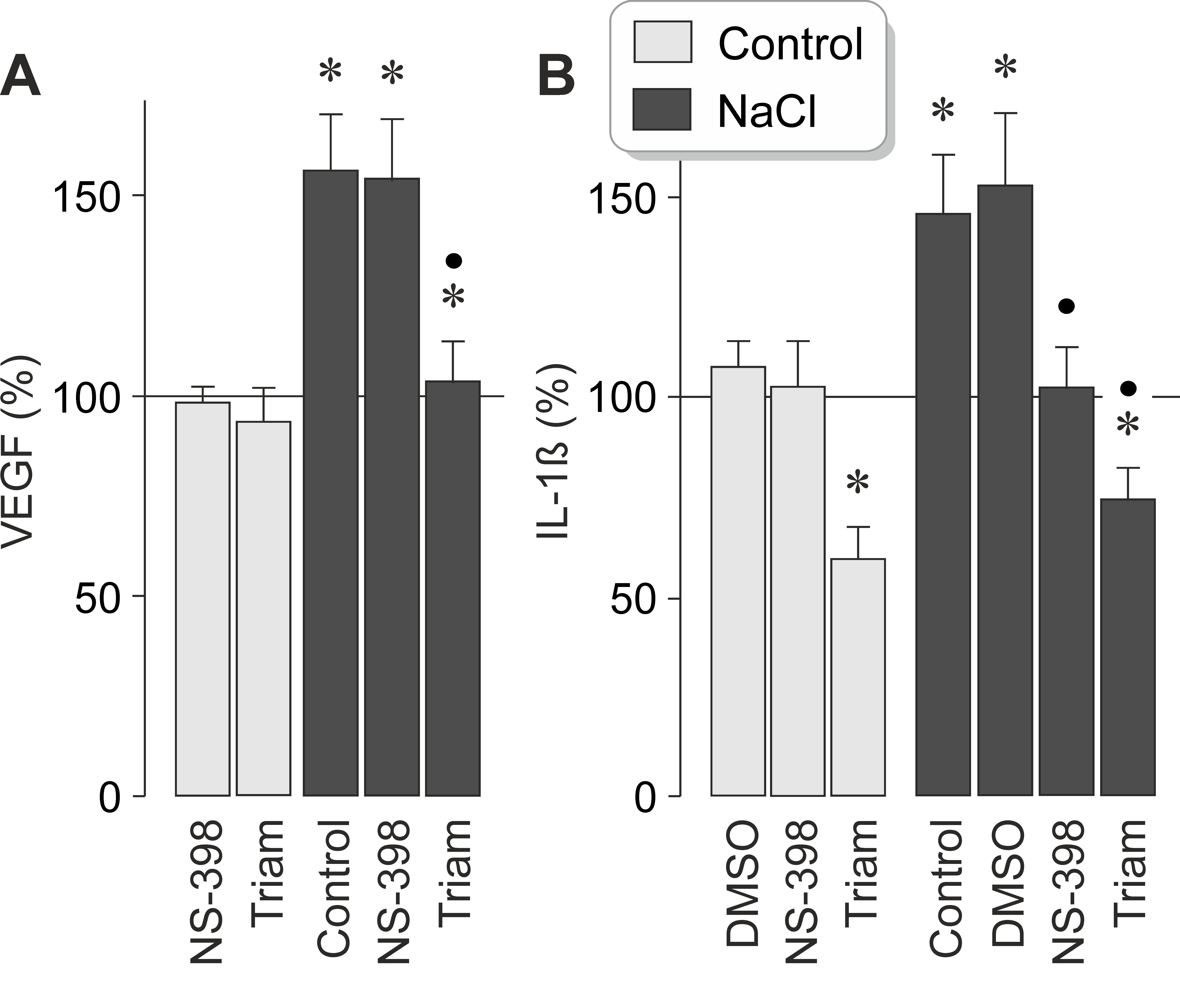 Figure 7. Effects of cyclooxygenase-2 (COX2) inhibition on NaCl-induced vascular endothelial growth factor A165 (VEGF-A165) and mature interleukin-1ß (IL-1ß) protein levels. A: Effects of COX2 inhibition on NaCl-induced increases of the extracellular level of VEGF-A165 protein and (B) the cytosolic IL-1ß protein level. The cells were stimulated for 24 (A) and 6 h (B) with high (+ 100 mM) NaCl in the absence and presence of the COX2 antagonist NS-398 (50 µM) and the anti-inflammatory glucocorticoid