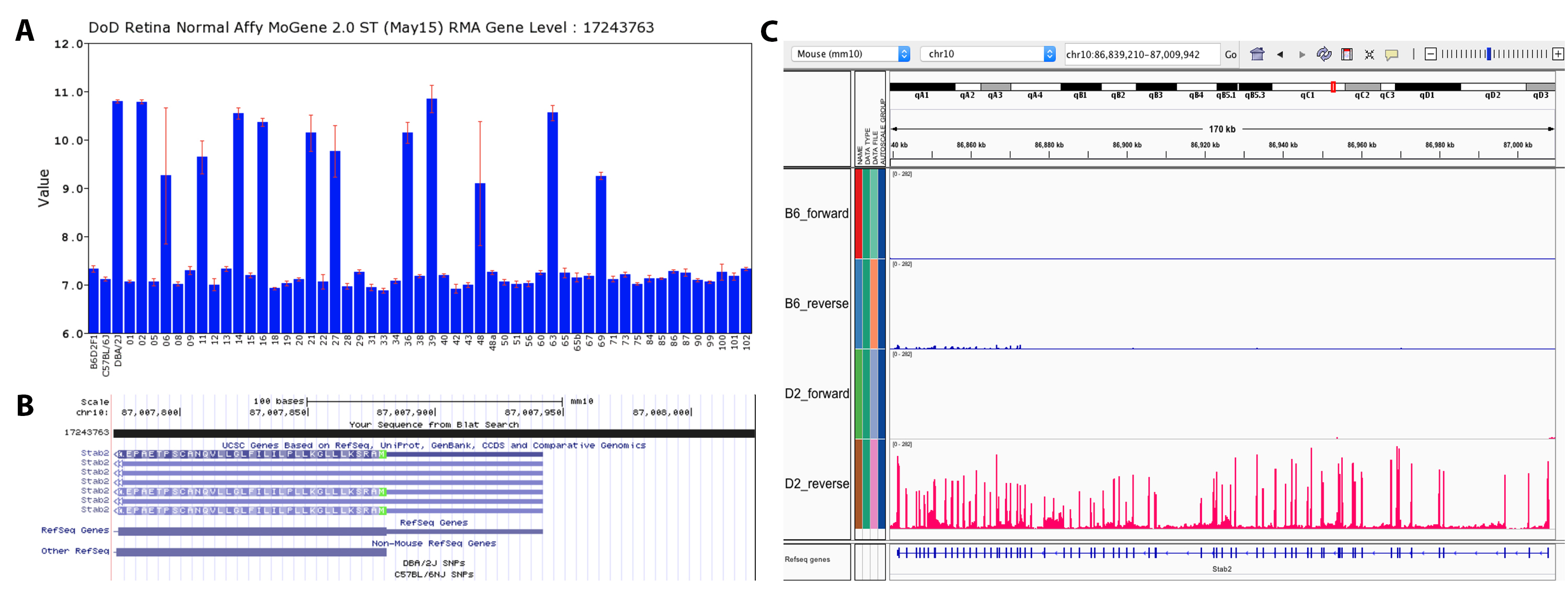 Stab2 mRNA (y-axis) across the BXD strains (x-axis) from the Department of Defense (DoD) database (Probe_17243763).