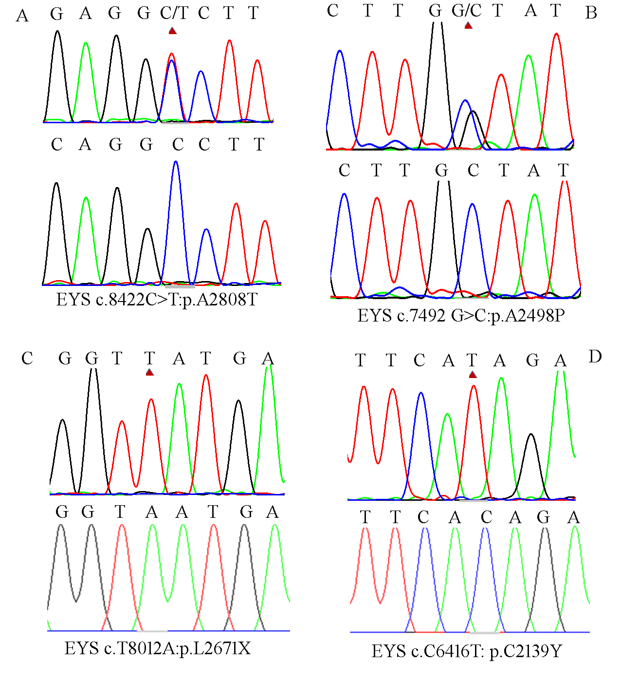 and their wild-type form (lower). Red arrows indicate the position of the mutated nucleotide. A,B: From RP-F1; C,D: from RP-F2.