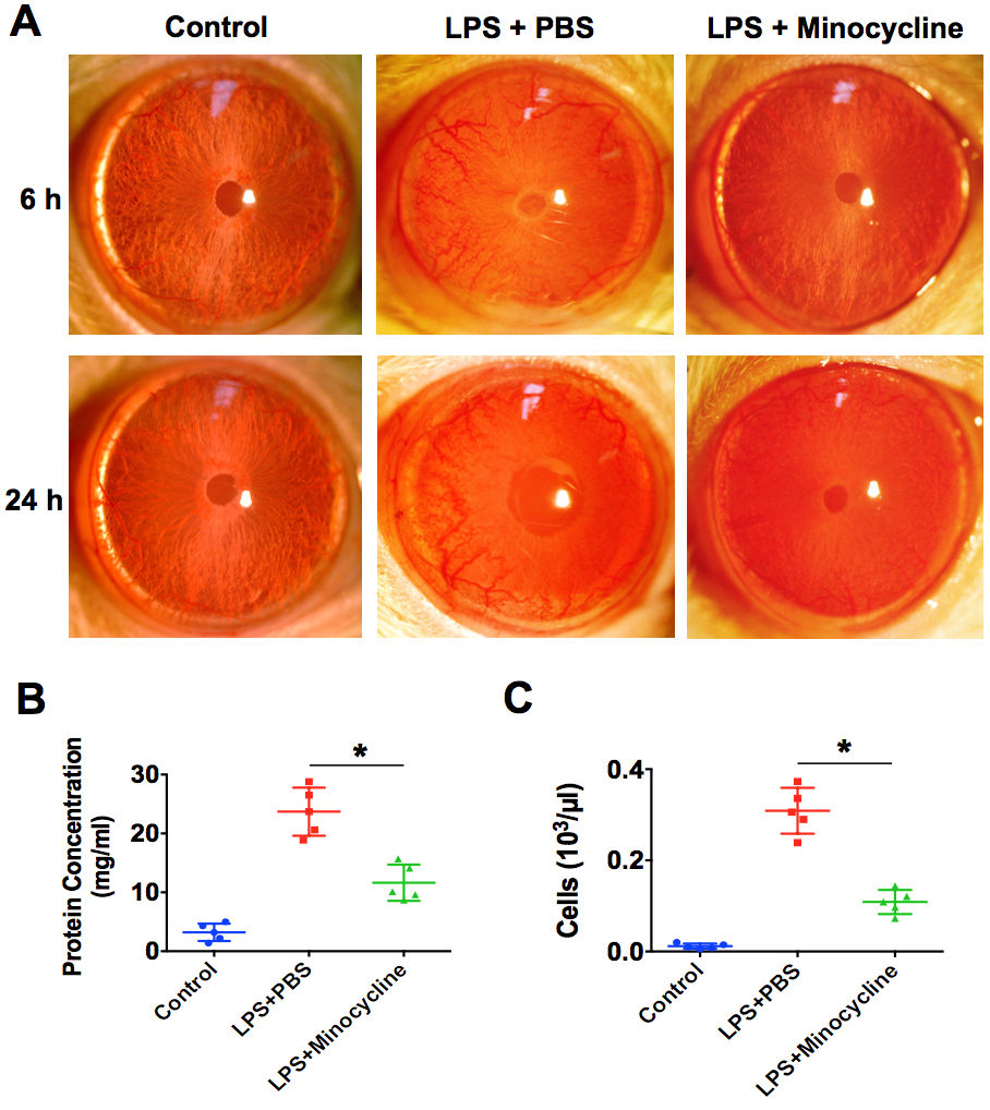 Figure 1. Minocycline attenuates the anterior inflammation in rat EIU. A: Treatment with 45 mg/kg of minocycline or PBS intraperitoneally 2 h before and after lipopolysaccharide (LPS) injection.