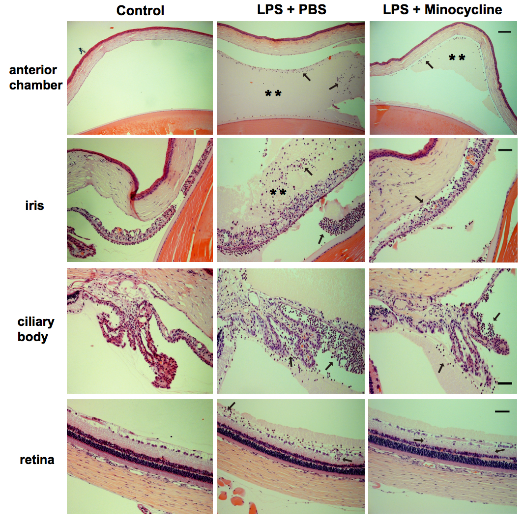 and lipopolysaccharide (LPS) stimulation with or without minocycline treatment eyes were stained with hematoxylin-eosin. Representative