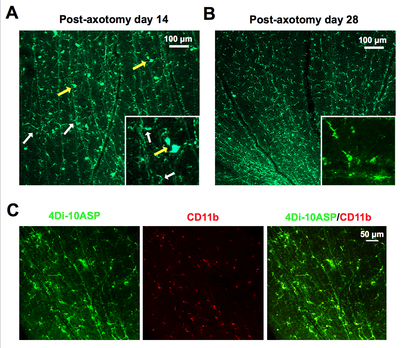 Scale bars: 100 μm. Inset: higher magnification. C: The retinas, which were labeled with 4Di-10ASP for 28 days, were stained with the microglial marker CD11b (red), and the