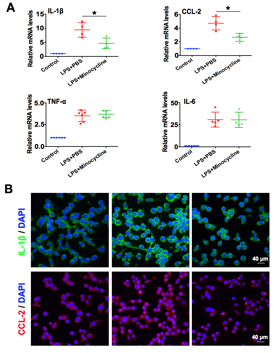 (LPS) with or without minocycline (50 μg/ml) for 6 h. *p<0.05 compared with the LPS plus PBS group. B: Immunofluorescent staining analysis of IL-1β (green) and CCL-2 (red) expression in BV-2 microglial cells exposed to 100
