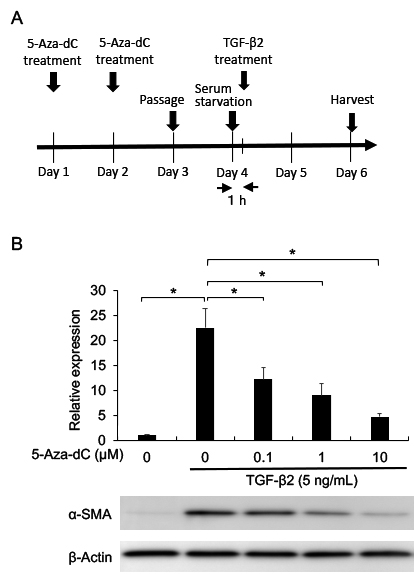 Figure 1. The effect of 5-aza-2'-deoxycytidine (5-Aza-dC) on α-SMA expression. A: Time course of the experiment. Primary human conjunctival fibroblasts were pretreated with 5-Aza-dC once daily for 2 days.