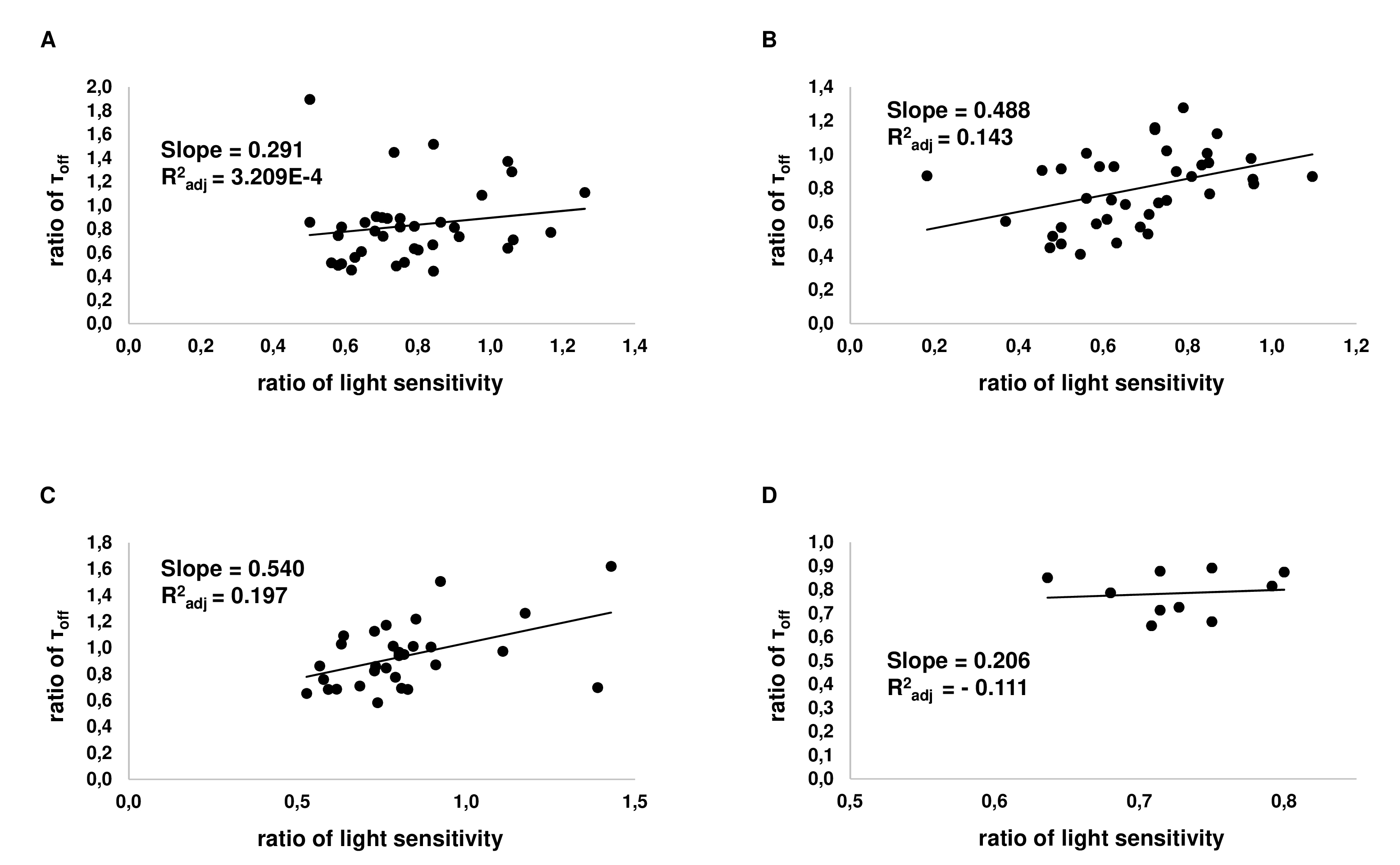 Figure 7. Correlation of changes of light sensitivity and the time of photoresponse turn off in individual cells. On the Х-axis, the