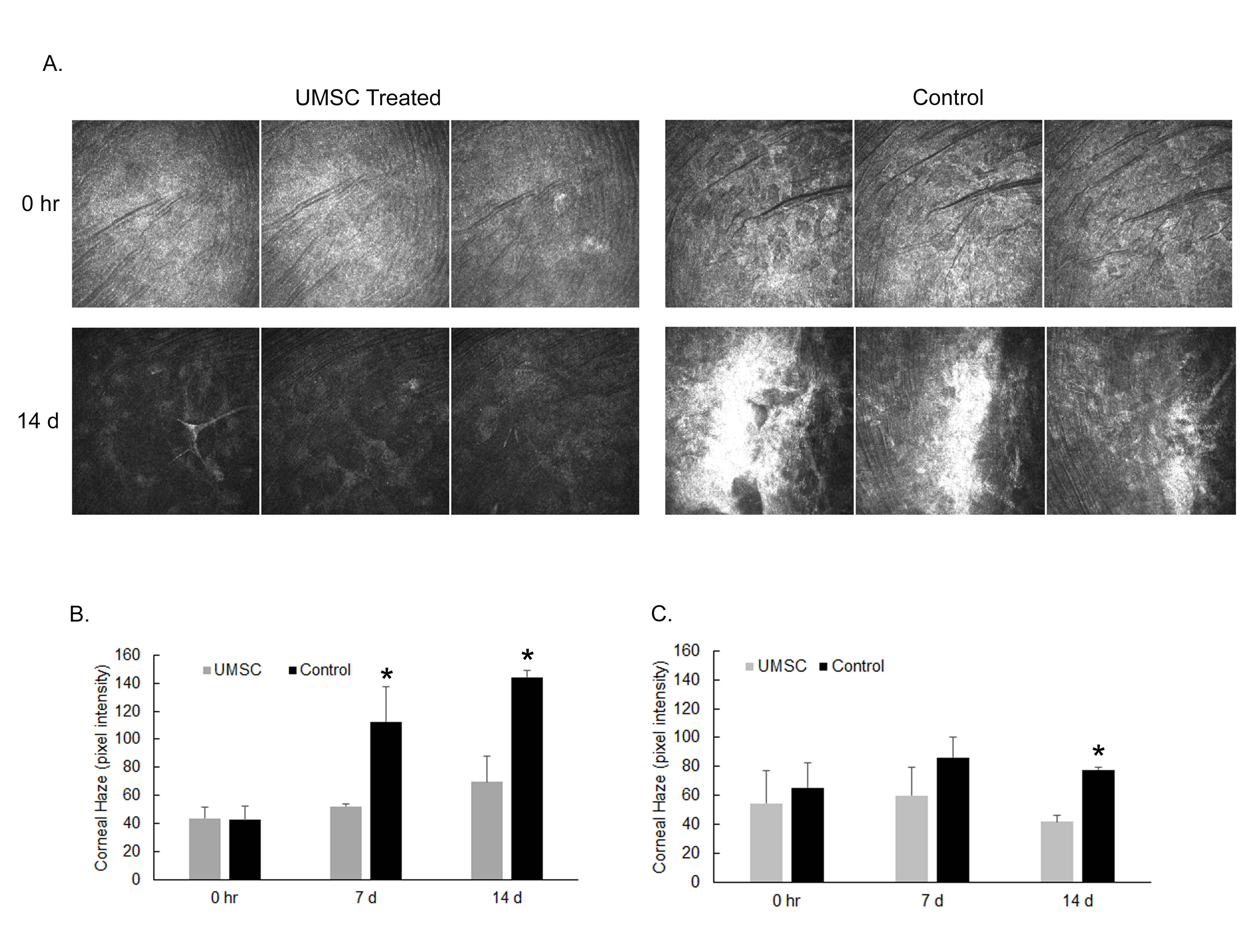 Figure 3. Recovery of corneal transparency in UMSC-treated eyes following injury in Col5a1-deficient mice. A, B: Representative CutView images acquired from a volumetric scan using in vivo confocal microscopy of Col5a1 control mice (A) and Col5a1-deficient mice (B). C, D: Pixel intensity of the stroma was obtained using Image J software. C: Control mice showed improvement in corneal haze at 7 and 14 days post-umbilical cord mesenchymal stem/stromal cell (UMSC)