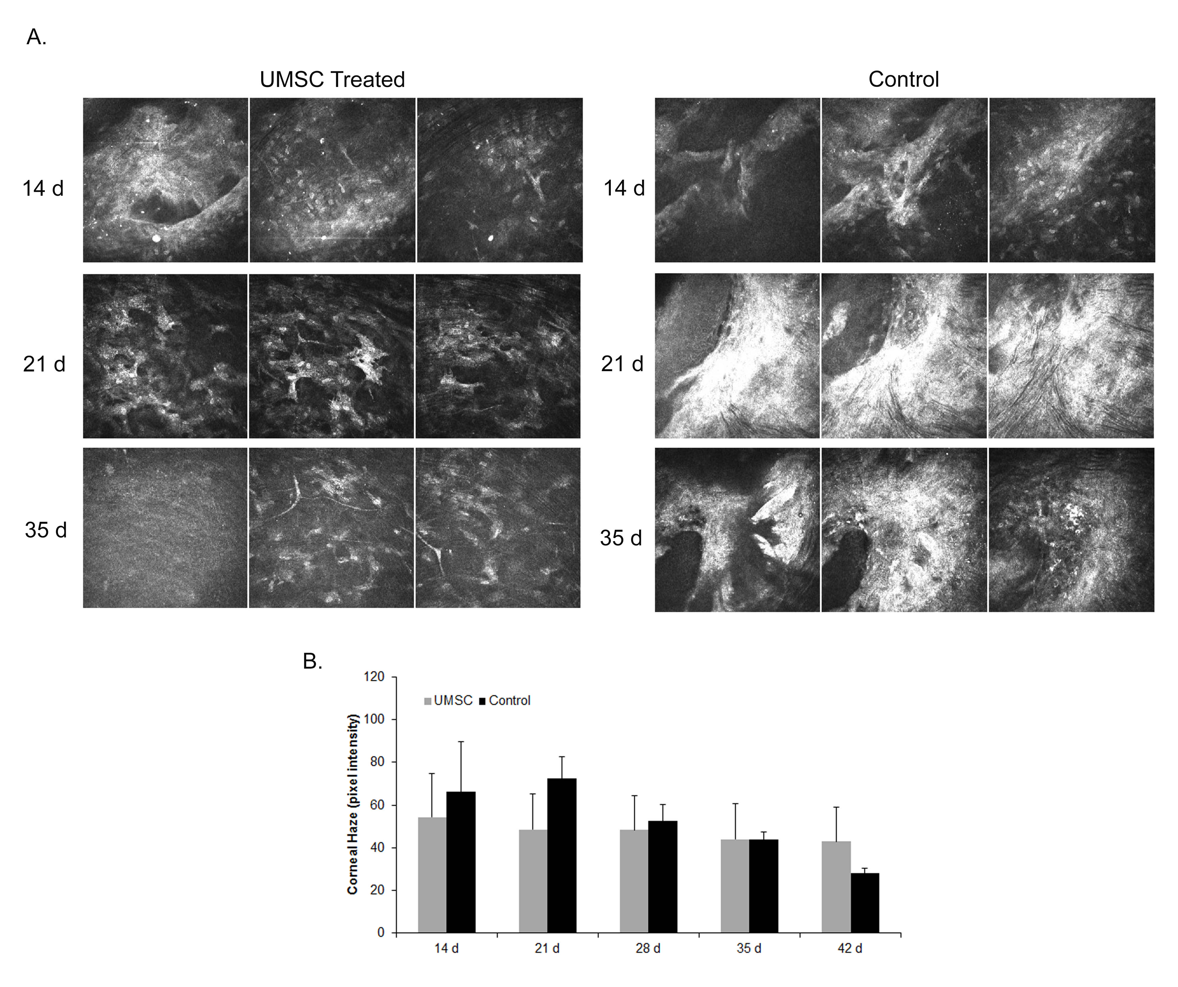Figure 7. Treatment of corneal scarification with UMSCs. A 2-mm central keratectomy was created in C57BL/6J mice and left alone for