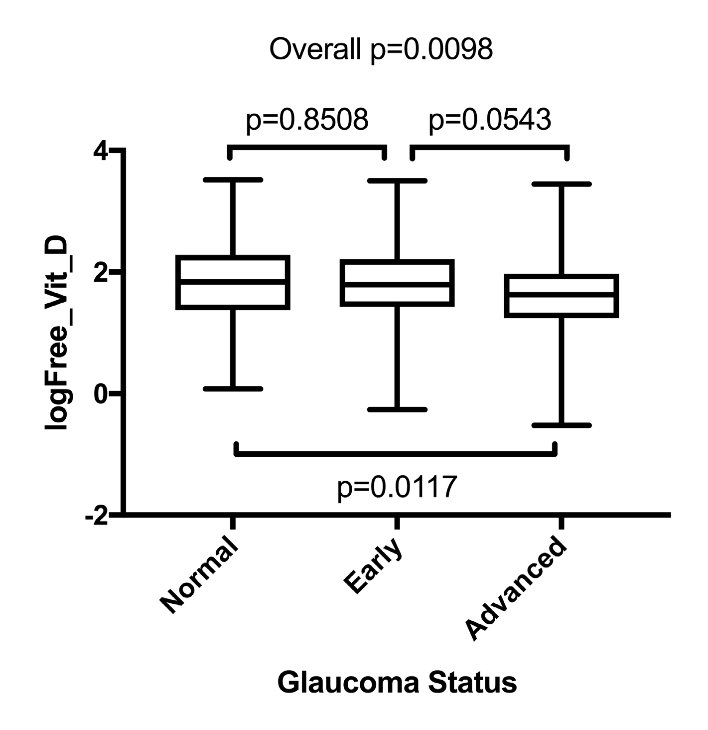 log free vitamin D levels in each of the three study groups. The p value on the right of the figure was obtained from the