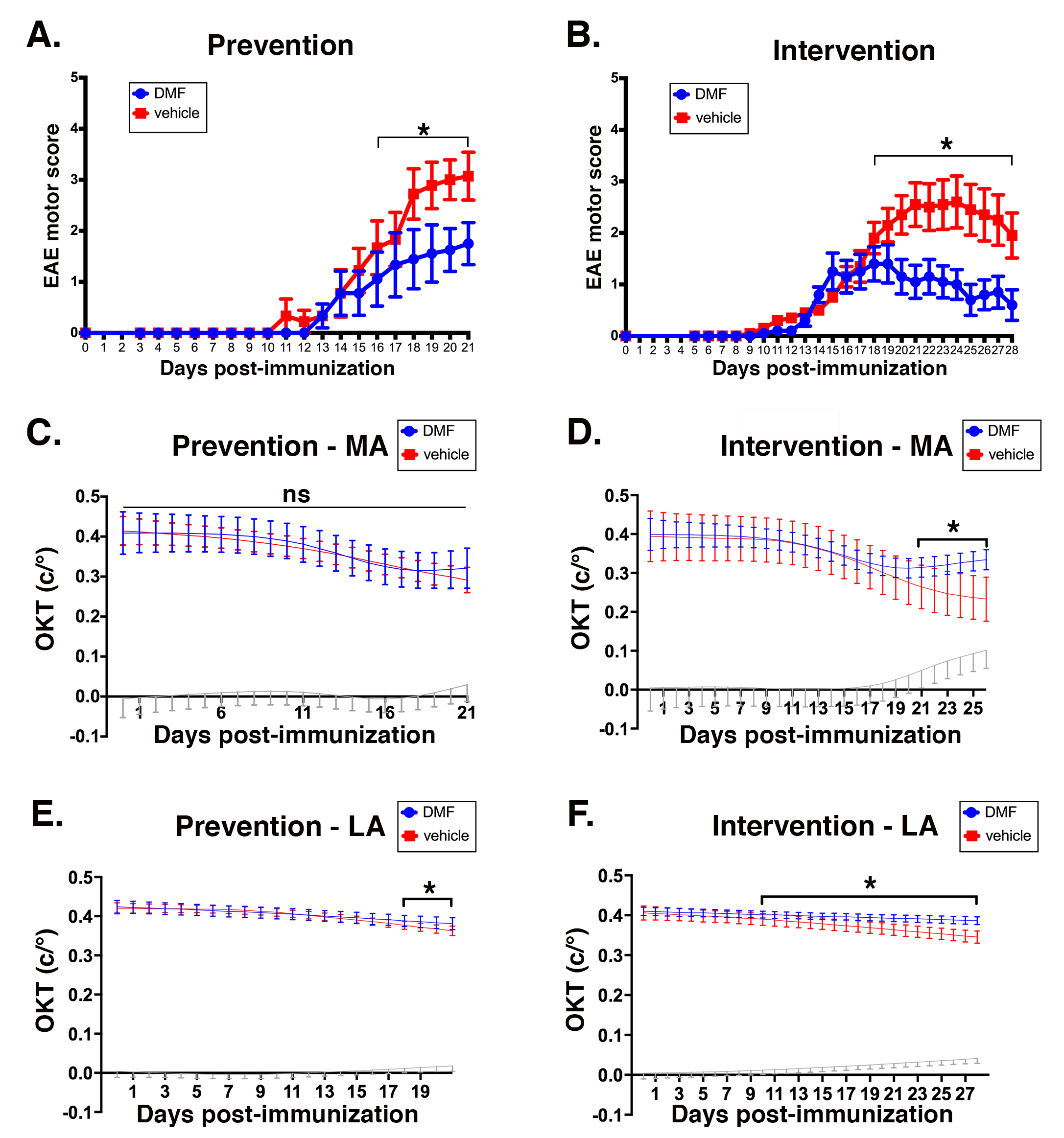 Figure 2. DMF treatment mitigates EAE-induced motor and visual deficits. A, B:Comparison of motor scores between dimethyl fumarate (DMF; blue) and methylcellulose (vehicle; red) in a prevention regimen