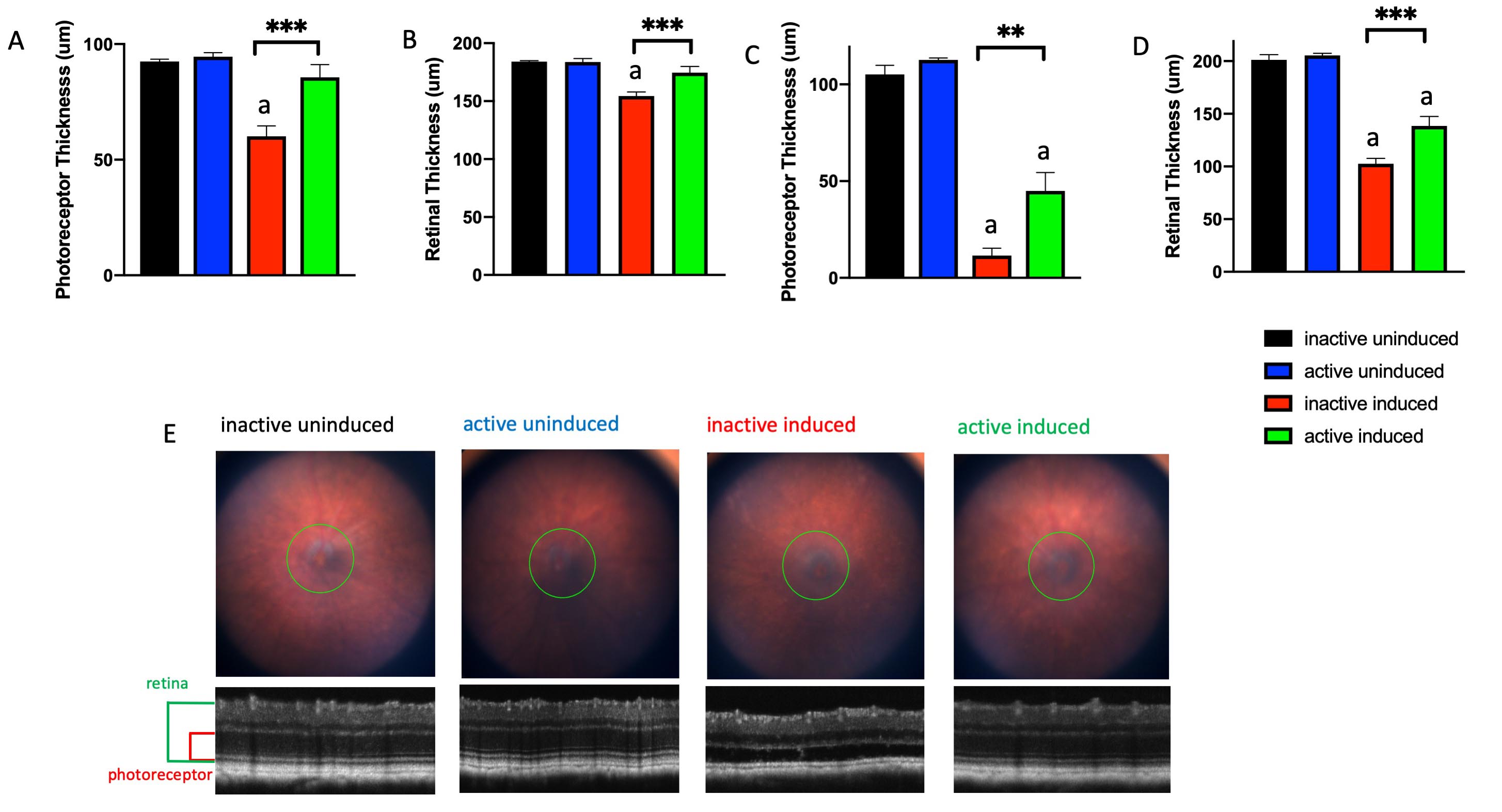(green bar) exhibited statistically significant preservation of layer thickness. E. Representative fundus images and corresponding optical coherence tomography (OCT) images from each group. ap<0.05 versus all other groups. Other comparisons as indicated in the figure; **p<0.01, ***p<0.001 with one-way ANOVA with