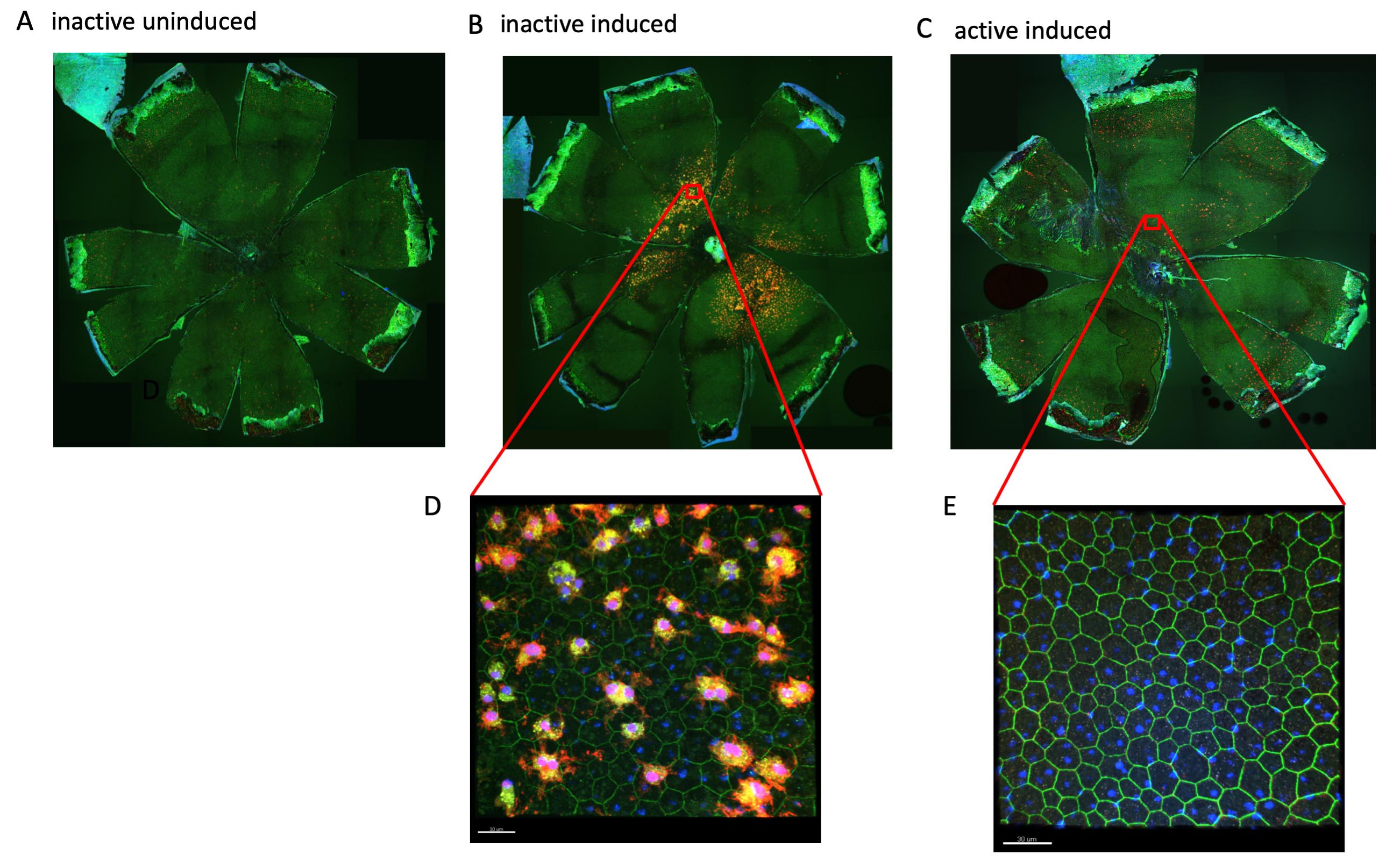 for Iba-1 (red), ZO-1 (green), and 4′,6-diamidino-2-phenylindole (DAPI) (blue). A–C: Representative 100X fluorescent confocal microscopy images of flatmounts, RPE apical side facing up. A: Flatmounts from the uninduced, inactive mice had little or no Iba-1 immunosignal. B: Flatmounts from the inactive induced mice exhibited heavy Iba-1 staining. C: Flatmounts from the induced but active mice exhibited almost no Iba-1 staining, similar to samples from the uninduced mice.
