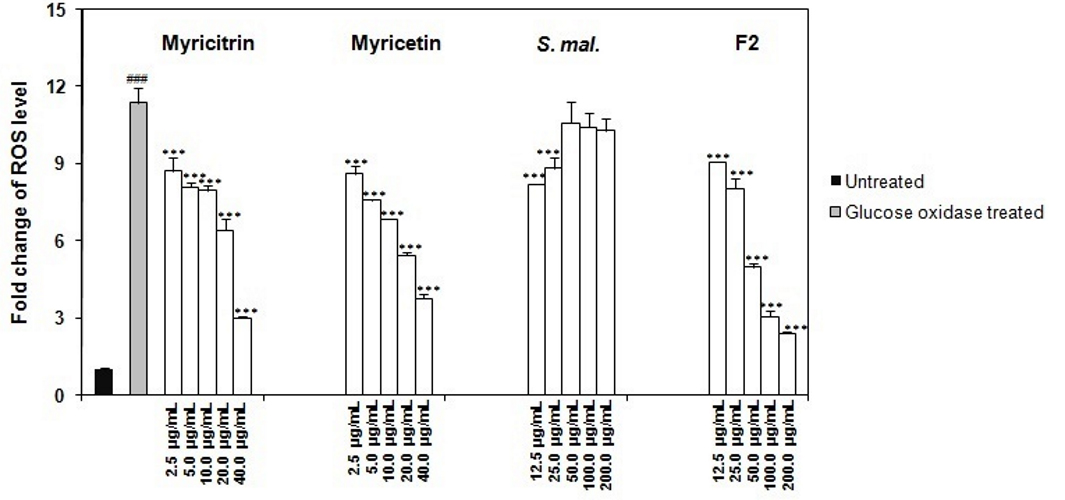 of Syzygium malaccense, and F2 (myricetin derivatives) for 2 h before exposure to GO-H2O2 induced stress. The concentration of glucose oxidase (GO) used is 12 mUnit/ml. Intracellular ROS that was generated during