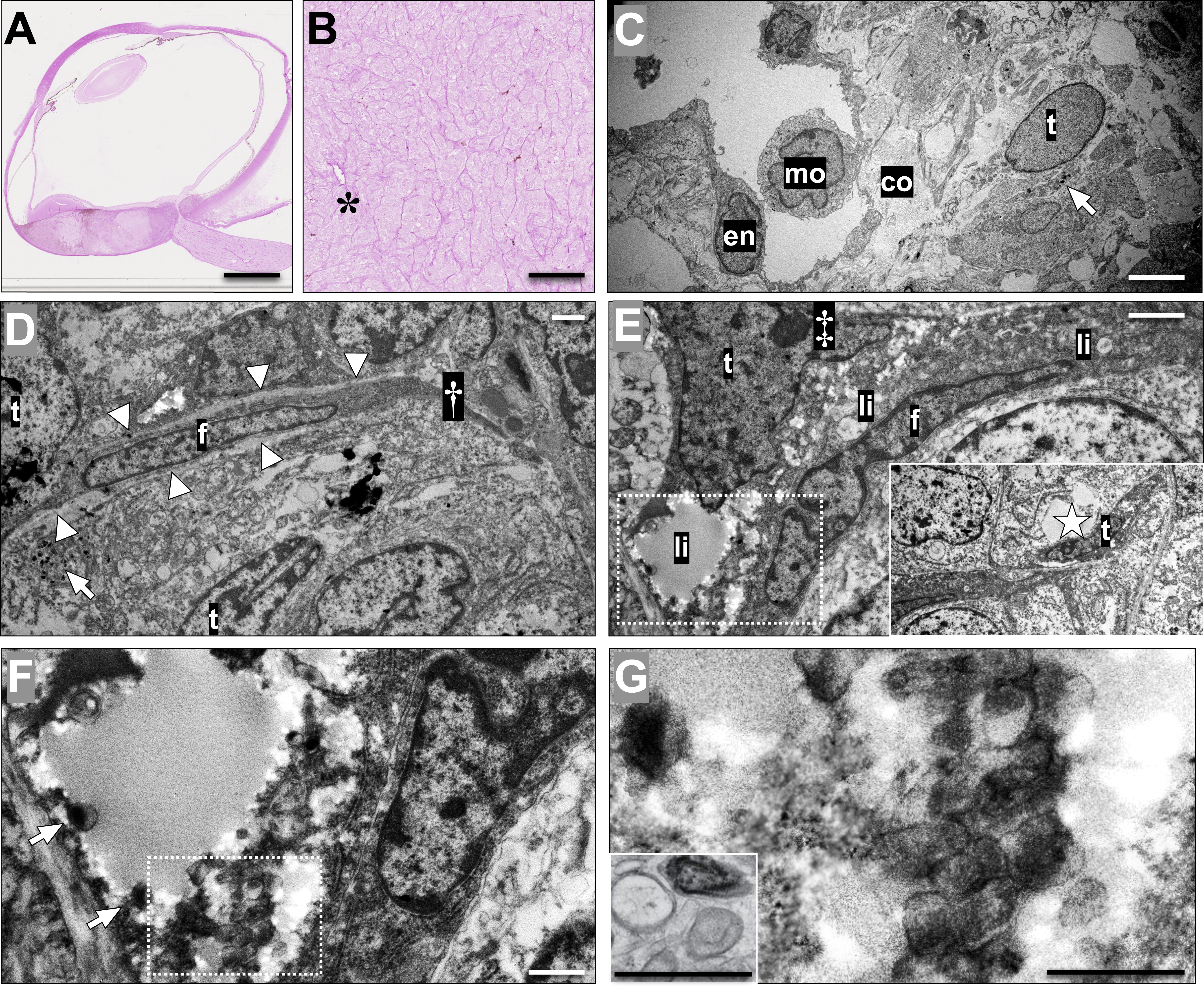 E: In contrast, in yet another tumor area, a tumor cell (t), characterized by a large nucleus with a nucleolus (‡), can be