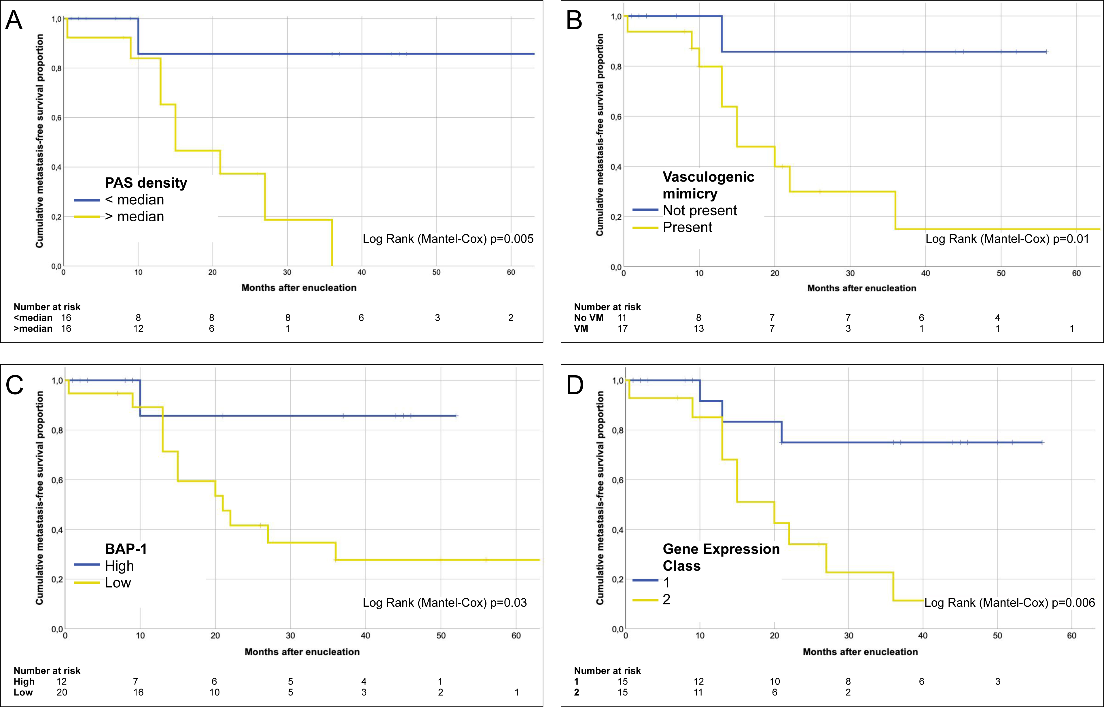 Figure 4. Kaplan–Meier cumulative metastasis-free survival proportion after enucleation. A: For patients with tumors that had a periodic acid-Schiff (PAS) density greater than the median, median survival was 15 months