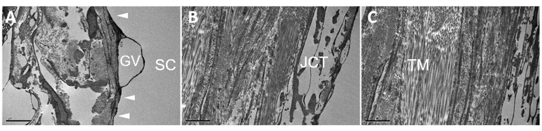 shown. B: The juxtacanalicular tissue (JCT) lies adjacent to the inner wall of SC and next to it the (C) trabecular meshwork (TM) beams are found. Scale bar=5 µm.