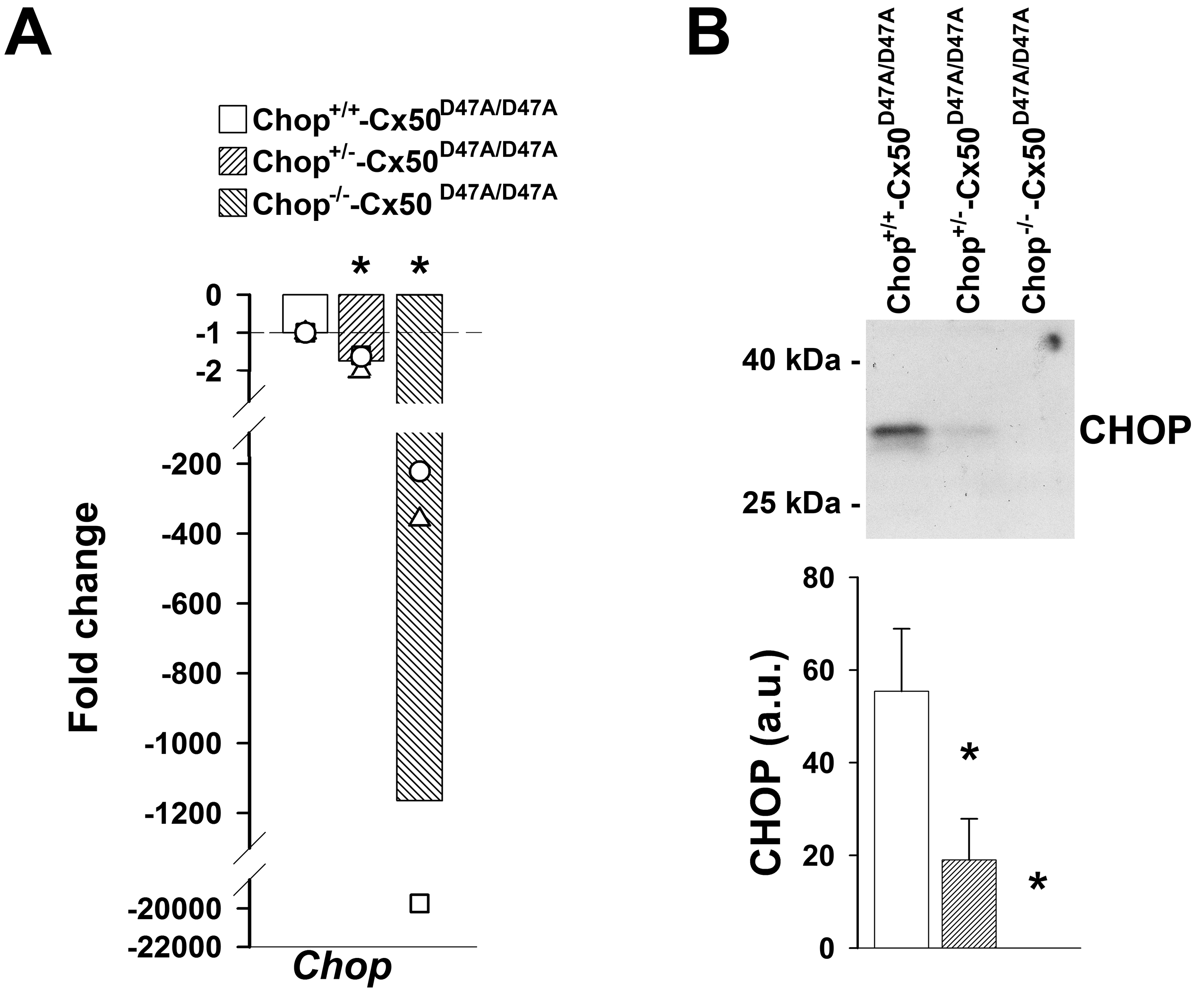 arbitrary units (a.u.). Asterisks denote significant differences from Chop+/+-Cx50D47A/D47A values (p<0.05).