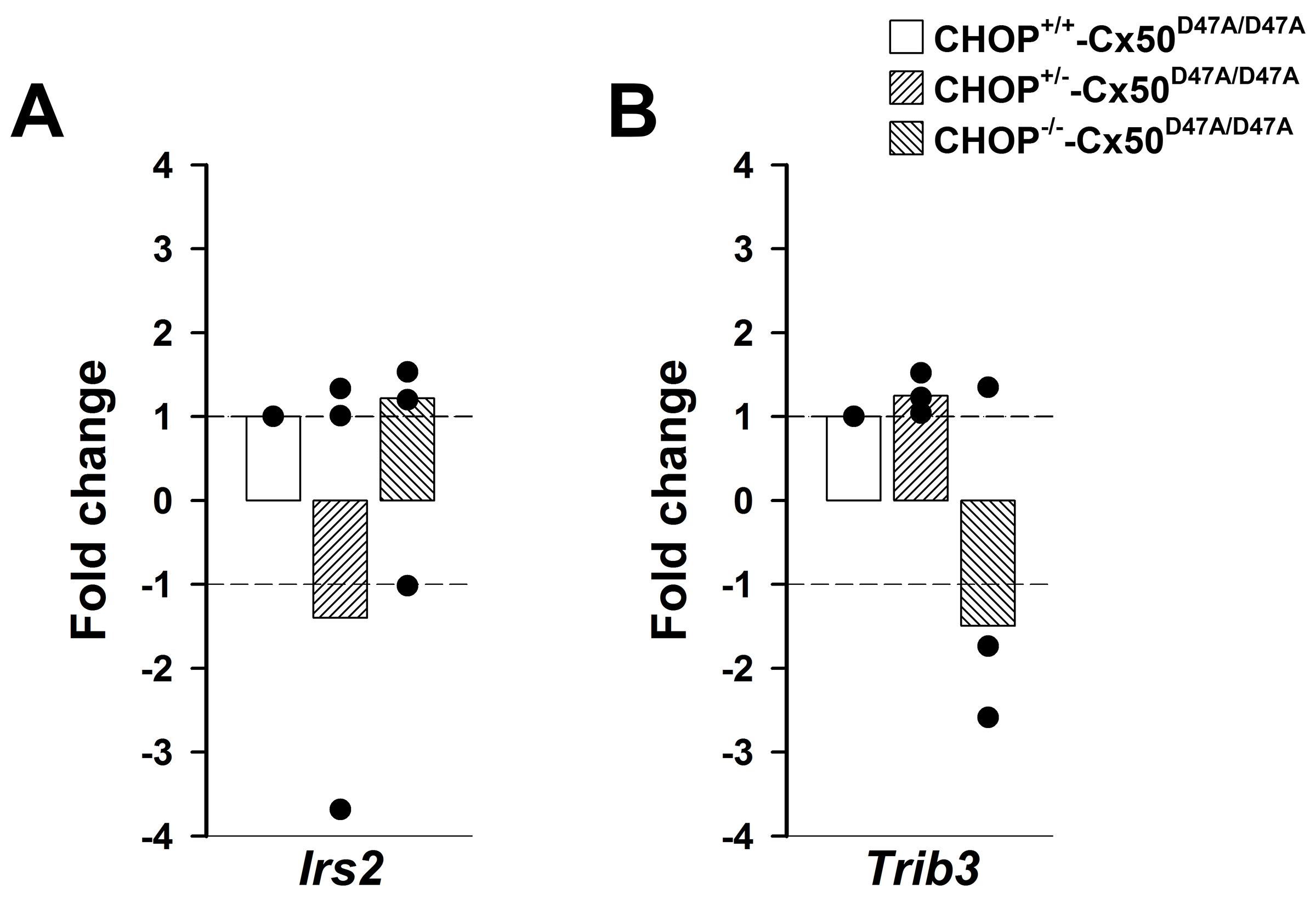 in three independent experiments (black circles) using the value obtained in Chop+/+-Cx50D47A/D47A littermates as the reference (short dashed lines at fold change = +1 and −1).
