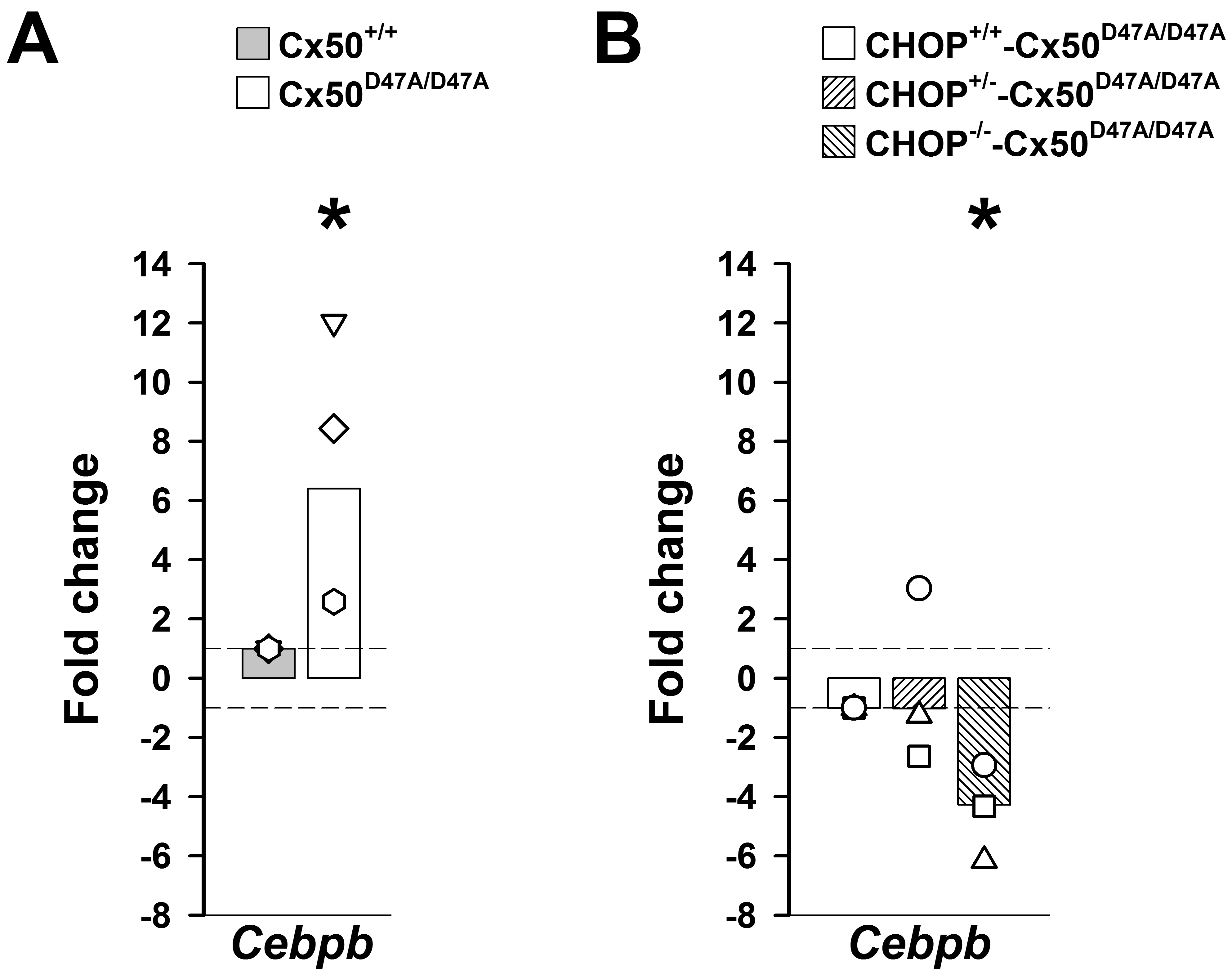 wild-type littermates. B: Graph showing the fold change of transcript levels for Cebpb as determined by RT-qPCR in 1-month-old lenses from homozygous Cx50D47A mice that were heterozygous (Chop+/−-Cx50D47A/D47A) and homozygous (Chop−/−-Cx50D47A/D47A) Chop knockout relative to the levels in lenses from their littermates that were wild type for Chop (Chop+/+-Cx50D47A/D47A). The values obtained in each of three independent biological replicates are shown in different symbols (each representing