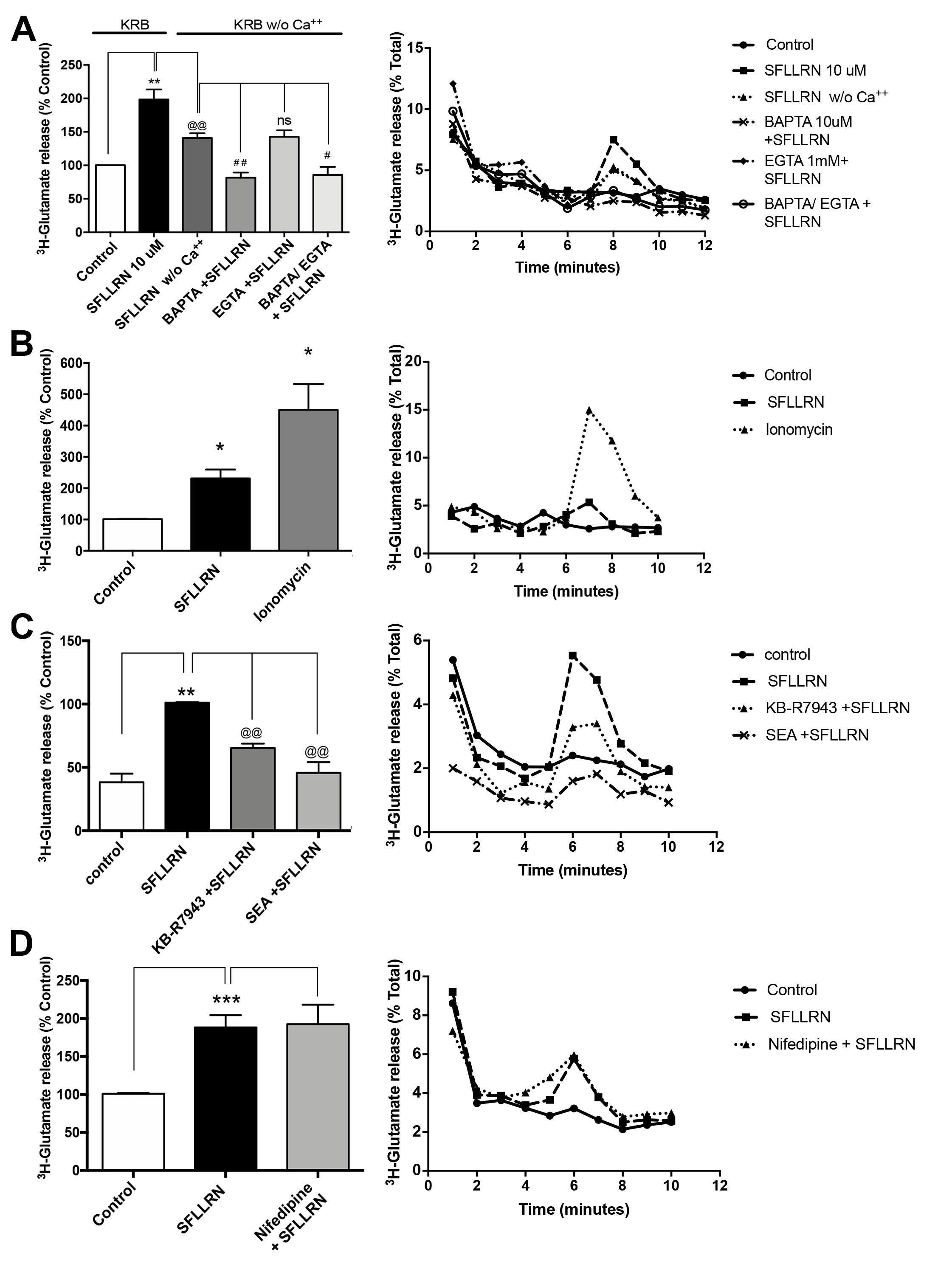 of three independent experiments. The Student t test with respect to negative control was statistically significant (**p<0.005); the Student t test with respect to SFLLRN w/ Ca2+ was statistically significant (@@p<0.005); the Student t test with respect to SFLLRN w/o Ca2+ was statistically significant (#p<0.05, ##p<0.005). B: Ca2+ release from intracellular stores is the main contributor to PAR-1 induced glutamate release. Cells were stimulated with