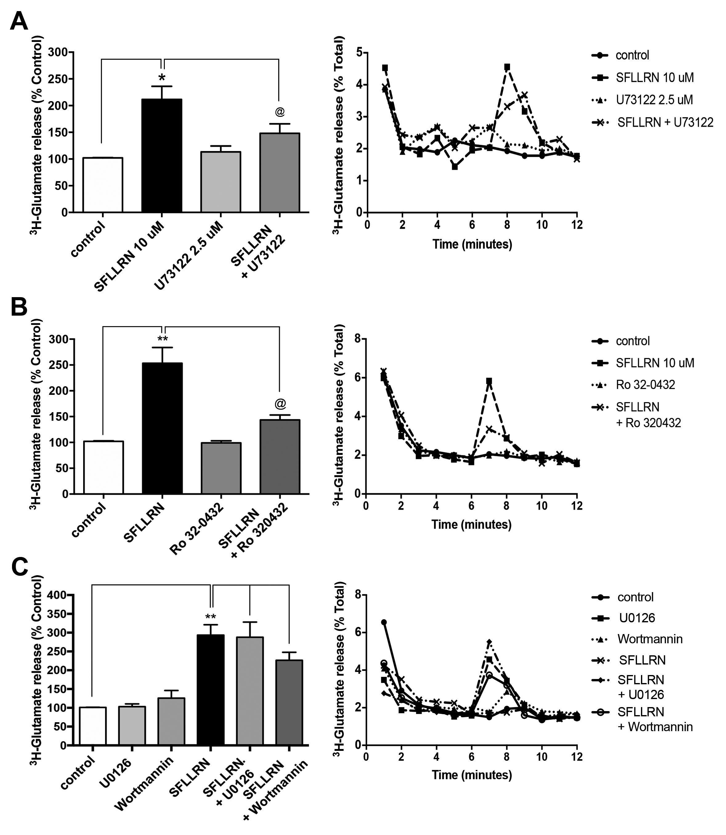 error of the mean (SEM) of three independent experiments. The Student t test with respect to negative control was statistically significant (**p<0.005). The Student t test with respect to SFLLRN was statistically significant (@ p<0.05). C: Thrombin-induced Glu release is independent of phosphoinositide 3-kinase (PI3K) and mitogen-activated protein kinase kinase