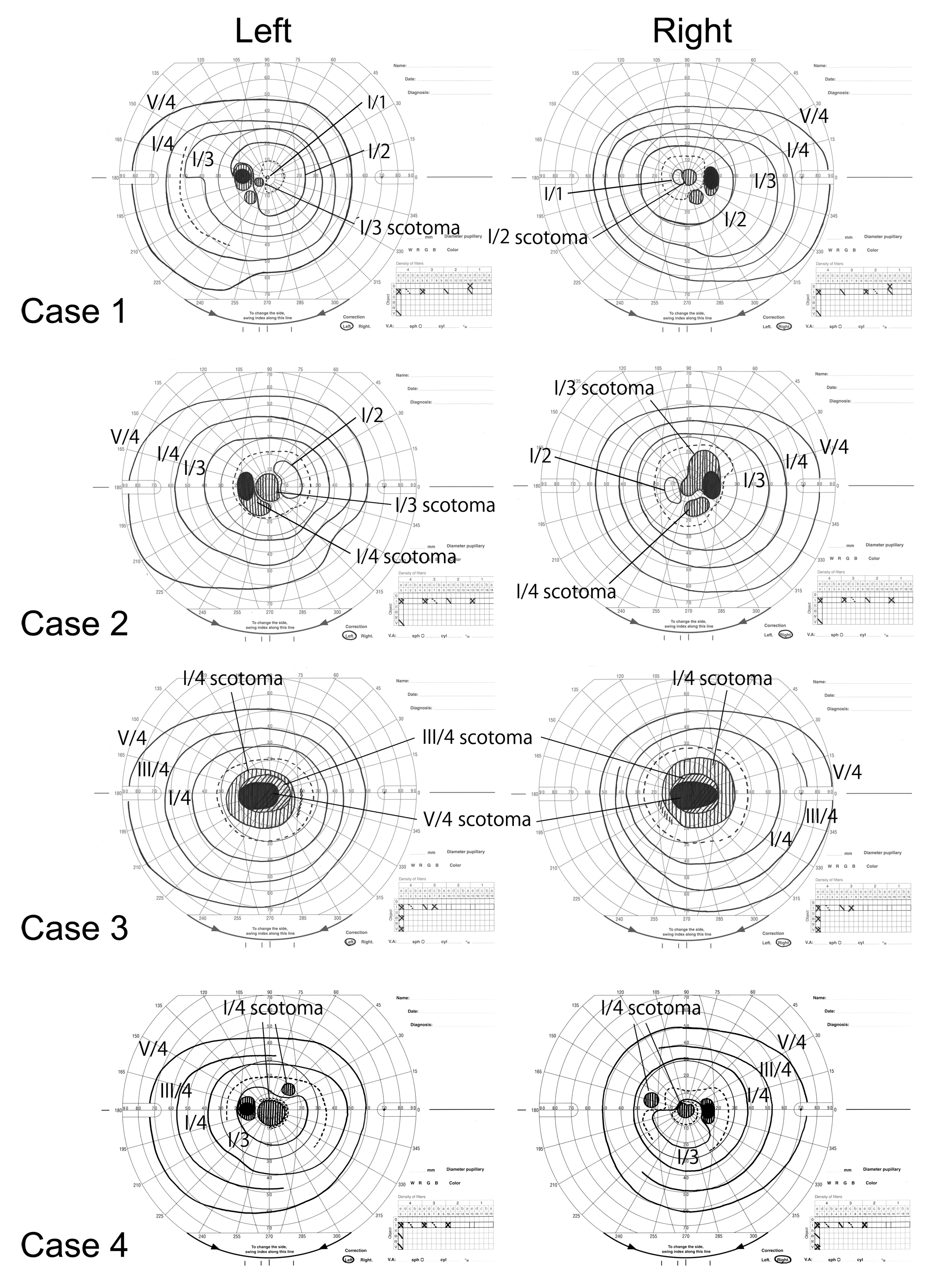 Results of Goldmann visual field tests. Central and paracentral scotomas, and the enlargement of Marriott’s blind spots were present in all DOA-plus cases.