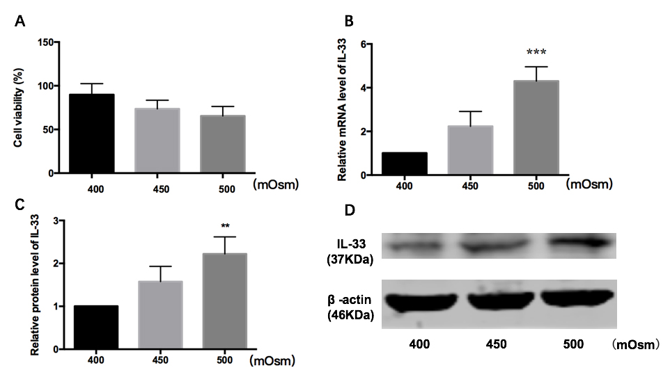Figure 1. Response of HConECs to hyperosmolarity. A: Cell viability decreased as hyperosmolarity increased, but showed no statistical significance. B: The level of IL-33 mRNA increased in 500 mOsm compared with 400 mOsm (4.35-fold upregulation, p<0.001, one-way ANOVA). C, D: IL-33 protein increased in 500 mOsm compared with 400 mOsm (2.22-fold upregulation, p<0.01, one-way ANOVA). The data shown