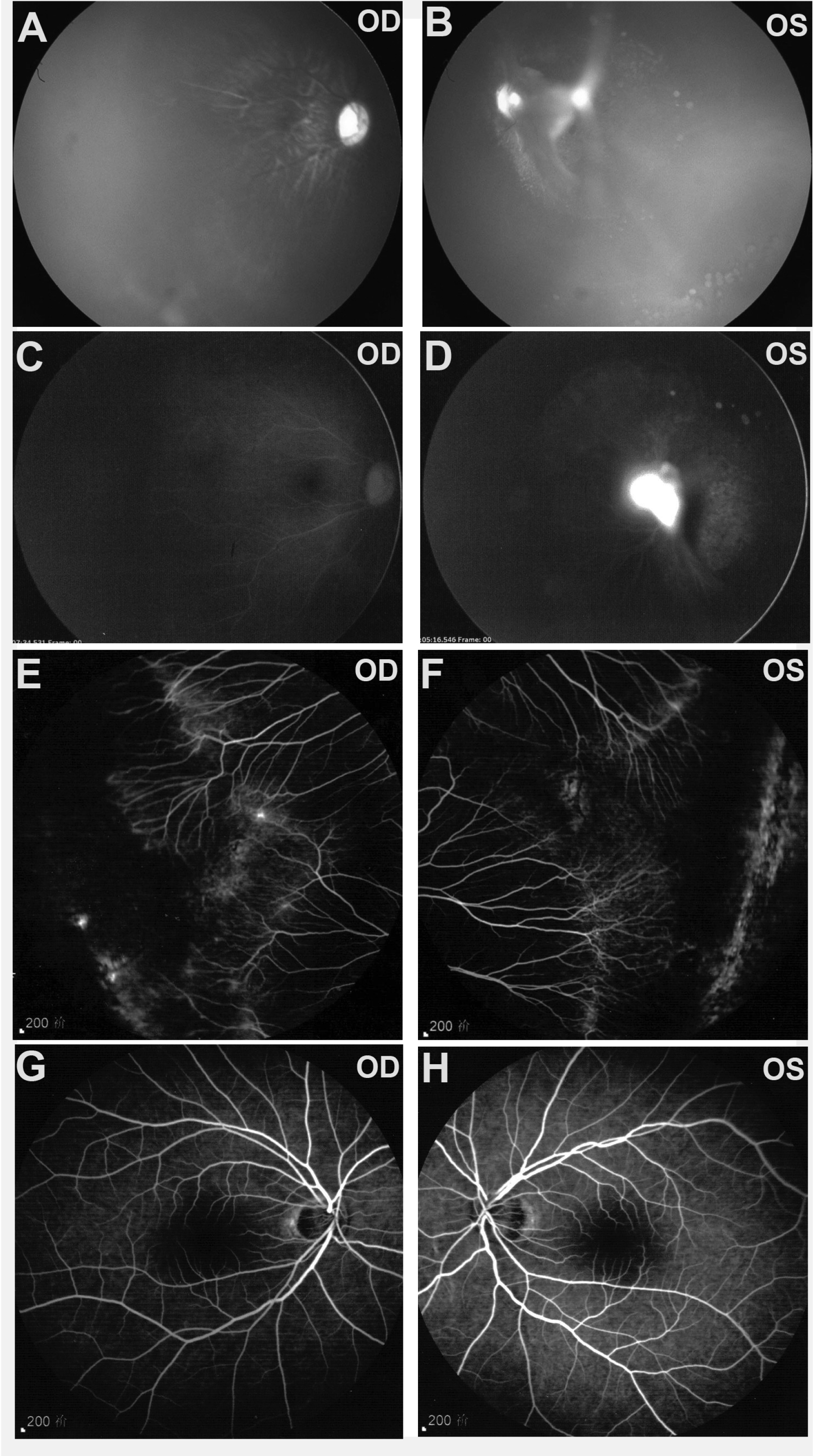 atrophy. E, F: Retinal vascular anomalous formation and an area of the avascular retina are observed in his affected father. G, H: His mother has normal retinal vasculature demonstrated with angiography.