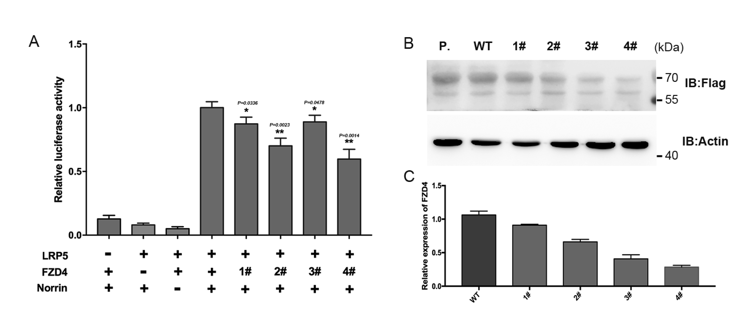 hours post-transfection, cell lysates were immunoblotted (IB) with FLAG or actin. P, positive control. C: Protein quantification: the gray value of FLAG-FZD4/actin and normalized wild-type to 1 (1#:c.1188_1192del/p.F396fs; 2#: