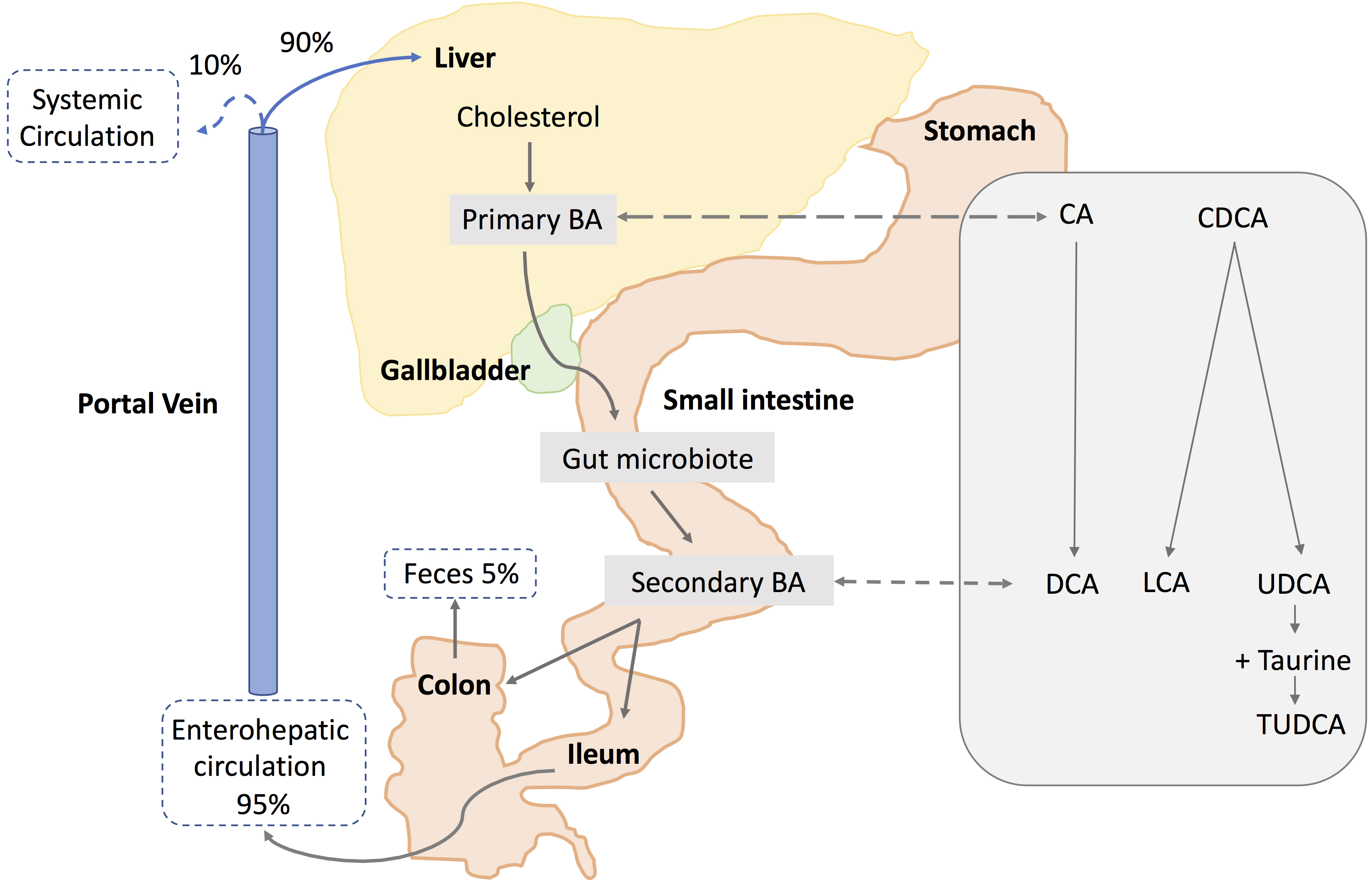 Figure 1. Schematic representation of synthesis and circulation of bile acids. Primary bile acids (BAs), cholic acid (CA), and chenodeoxycholic