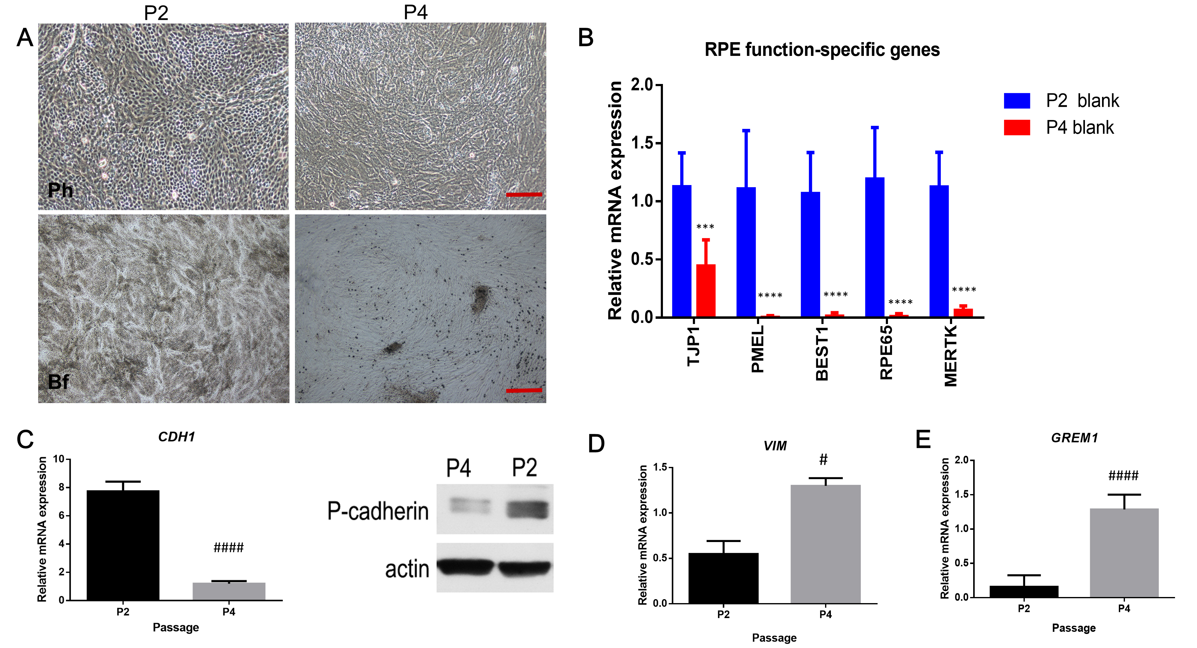 and more pigment in the bright-field micrographs, but passage 4 cells have a fibroblast-like shape and lost pigment. B: The related expression of RPE function-specific genes, such as TJP1, PMEL, BEST1, RPE65, and MERTK, decreased in passage 4 cells compared to passage cells. C: In passage 2 cells, CDH1 had higher expression compared to passage 4 cells, and the western blotting results show that P-cadherin, which is a specific