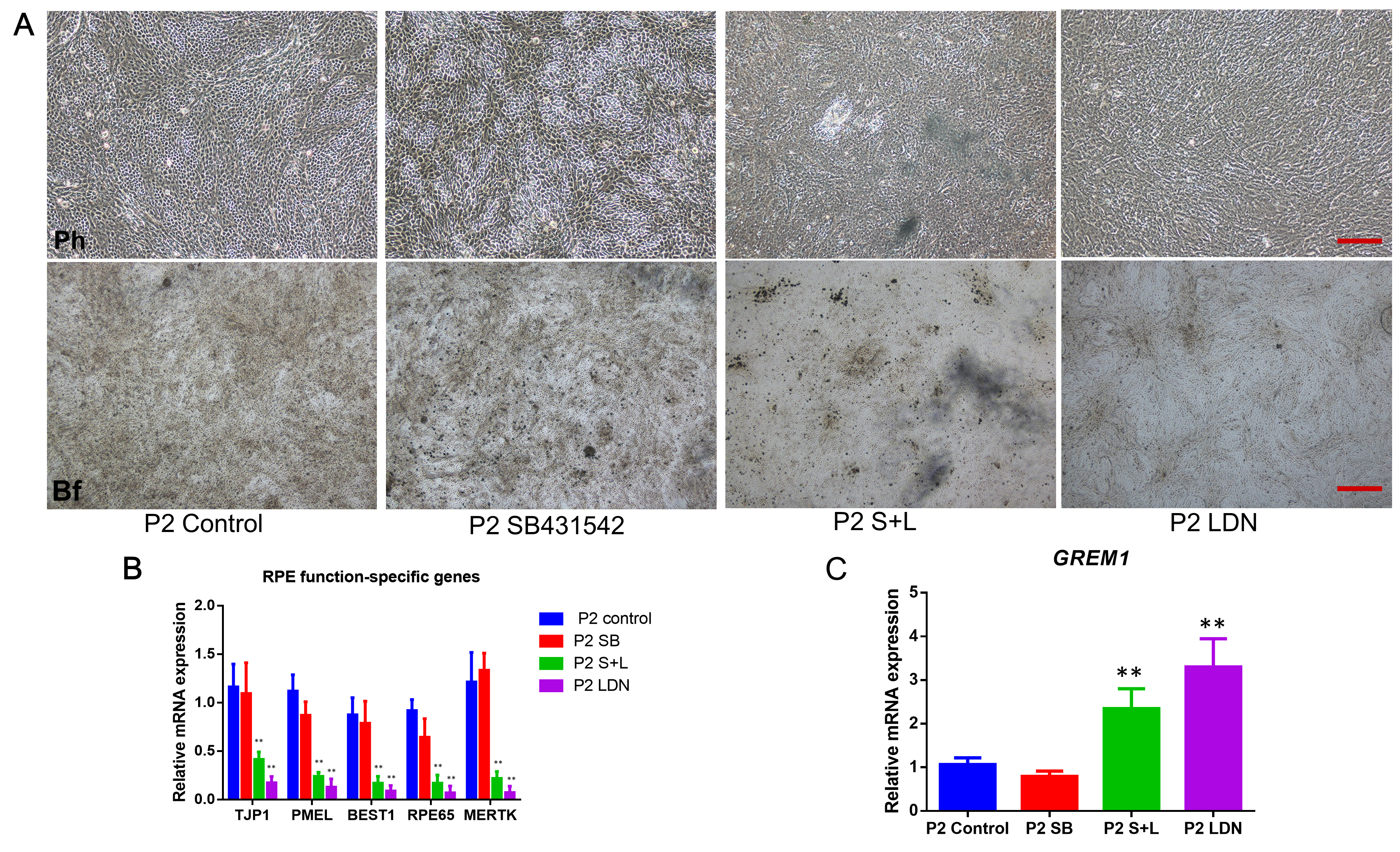 Figure 6. Completely blocking the BMP pathway inhibited redifferentiation in low passage fetal RPE cells and upregulated GREM1A: Four groups: the control group, SB group, S+L group, and LDN group. After treatment, the phase contrast micrographs demonstrate