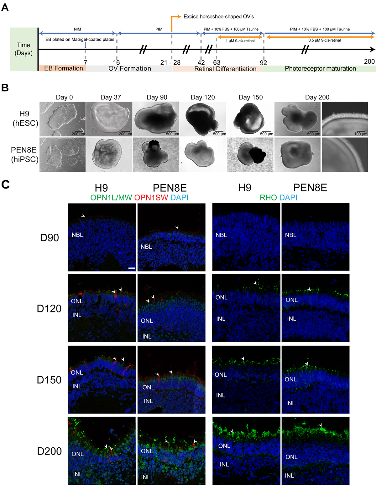 C: Immunohistochemistry analysis of H9- and PEN8E-derived retinal organoids using marker antibodies for cones (OPN1L/MW, OPN1SW)