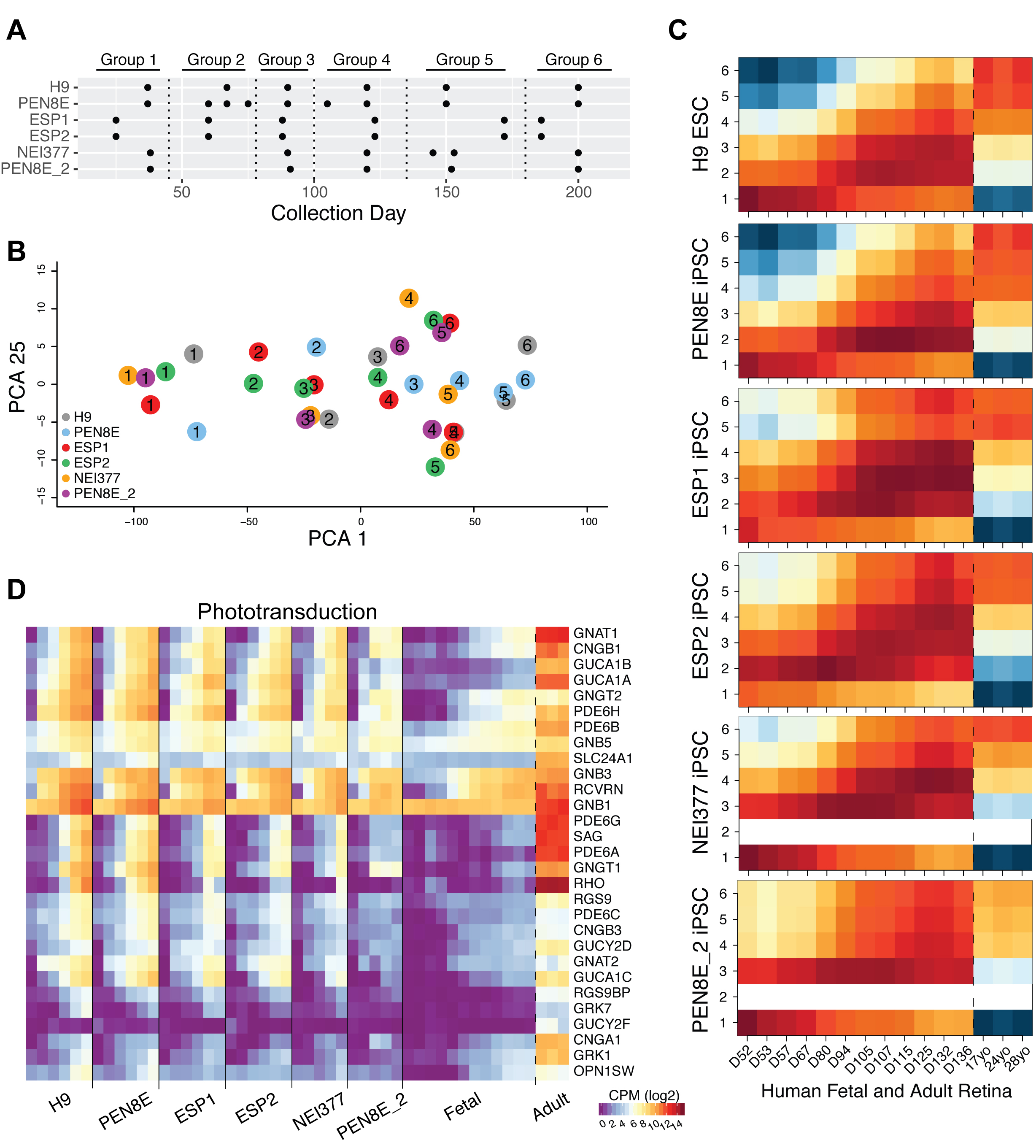 Figure 3. Comparative transcriptome analysis of hPSC-derived organoids and human retinal samples. A: Table showing organoid collection groups (Group 1: D25–37, Group 2: D50–75, Group 3: D80–90, Group 4: D105–125, Group 5: