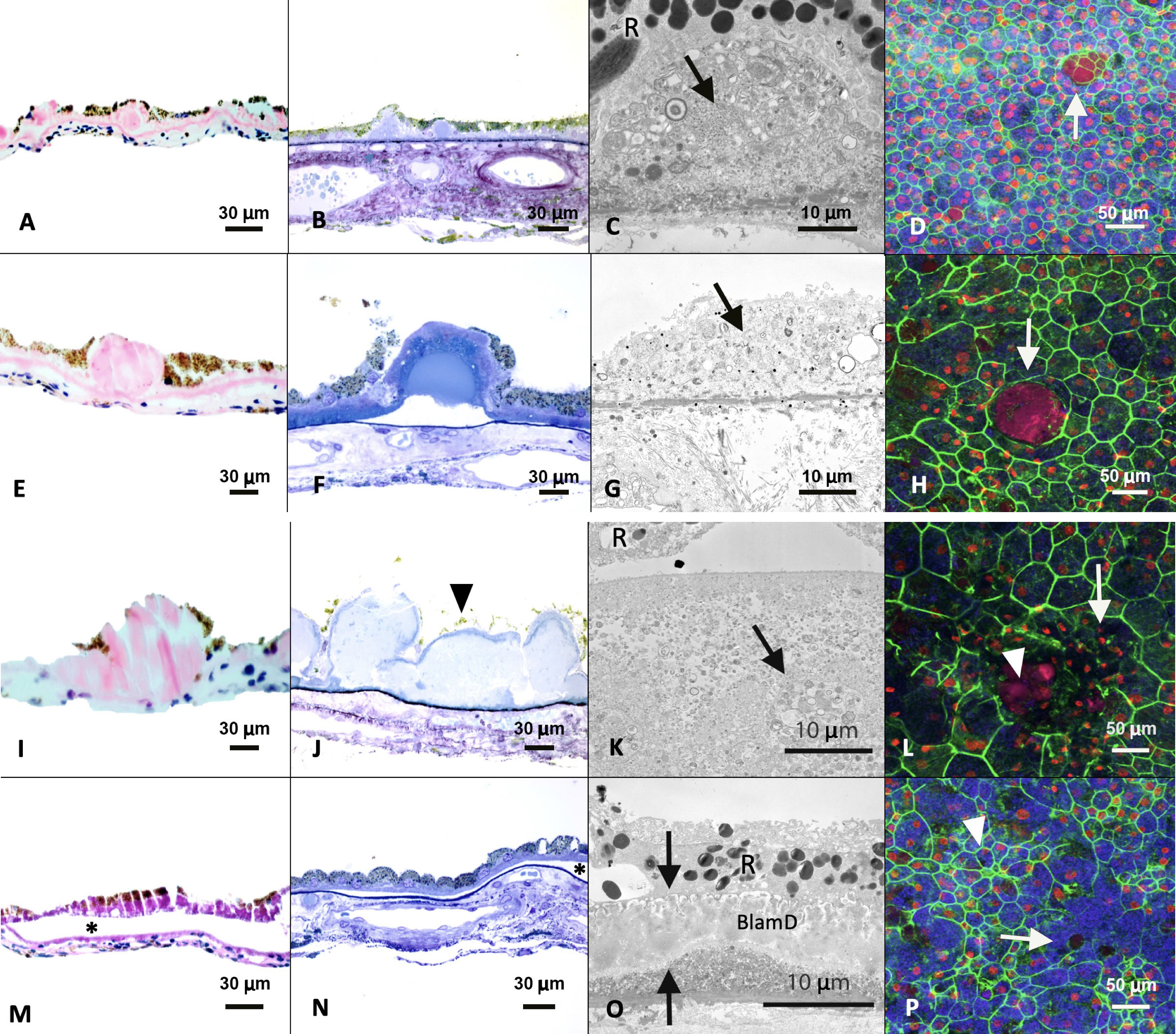 in areas (arrow). E,I (hematoxylin, high power objective [HPO]) M (periodic acid-Schiff, HPO), B, F, J, N (toluidine blue, HPO), C and K (osmium tetroxide/lead citrate, 5,800X), G and O (osmium tetroxide/lead citrate, 4,800X), D, H, L, P (AF635-phalloidin/propidium iodide 100X) RPE are green, druse and nucleus are red and autofluorescence are blue.