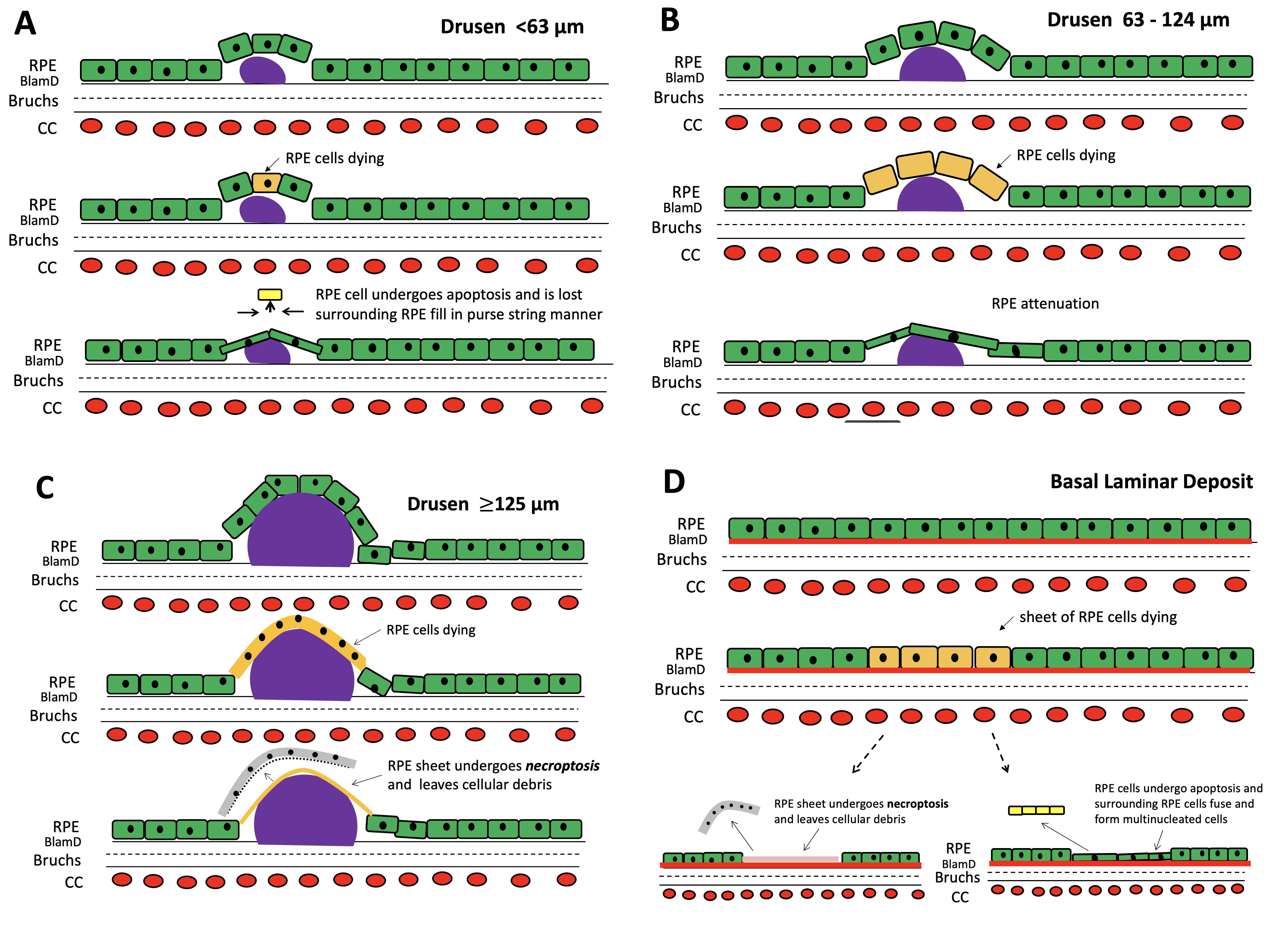 autophagy mechanism of RPE cell loss. C: Large drusen (≥125 µm). The pattern of RPE loss with remaining basal cytoplasm overlying large drusen is consistent with