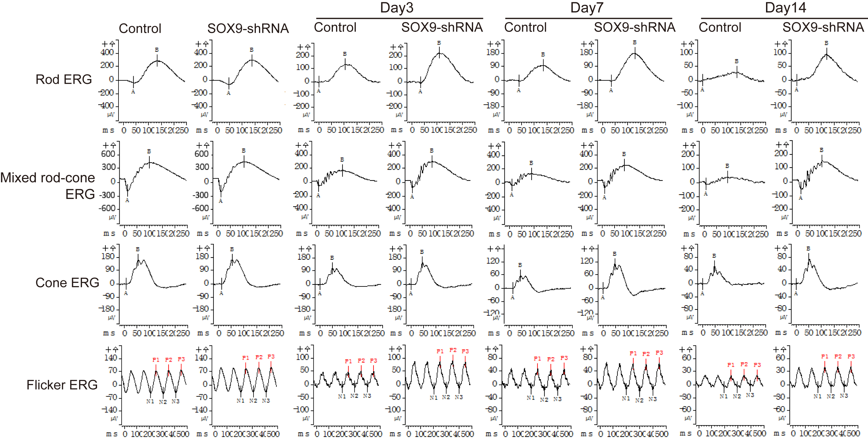 ERG and flicker ERG, respectively) from the control and Sox9-shRNA groups were recorded on days 3, 7, and 14 after light expose.