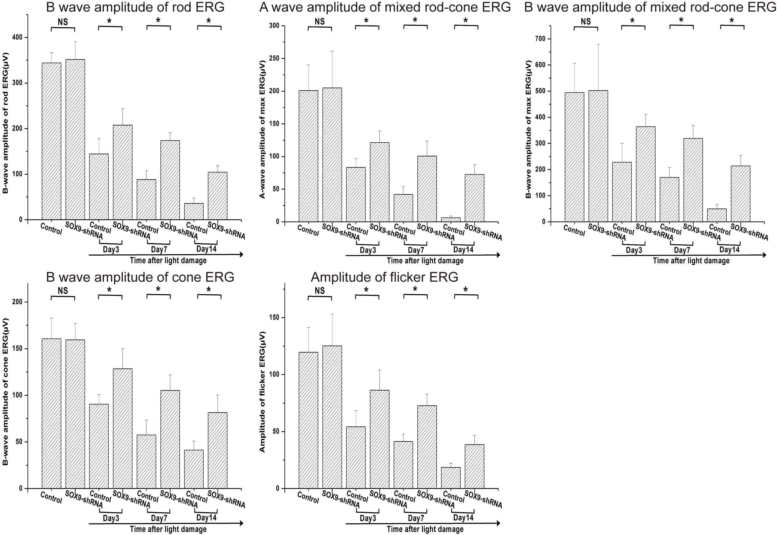 ERG waves in the Sox9-shRNA group compared with the control on days 3, 7, and 14 after light expose. Mean ± SD (n = 4), t test, *p<0.05.