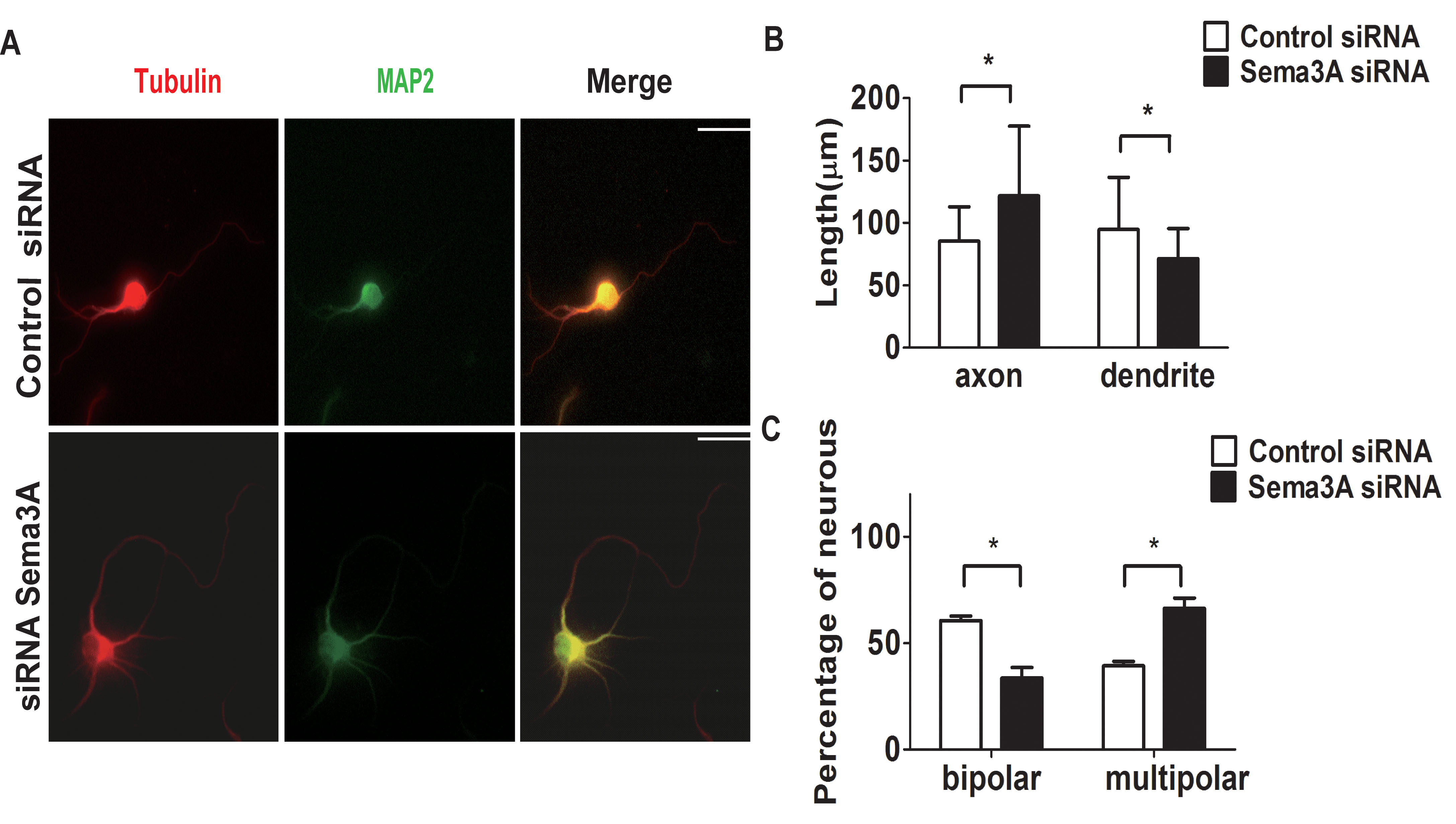 Scale bar, 40 μm. B: The longest axon and dendrite per RGC were measured after transfection with Sema3A siRNA at 120 h of culture. C: The percentage of bipolar cells was measured in Sema3A siRNA-treated RGCs after 120 h (mean ± SD; 37-71 cells per treatment,