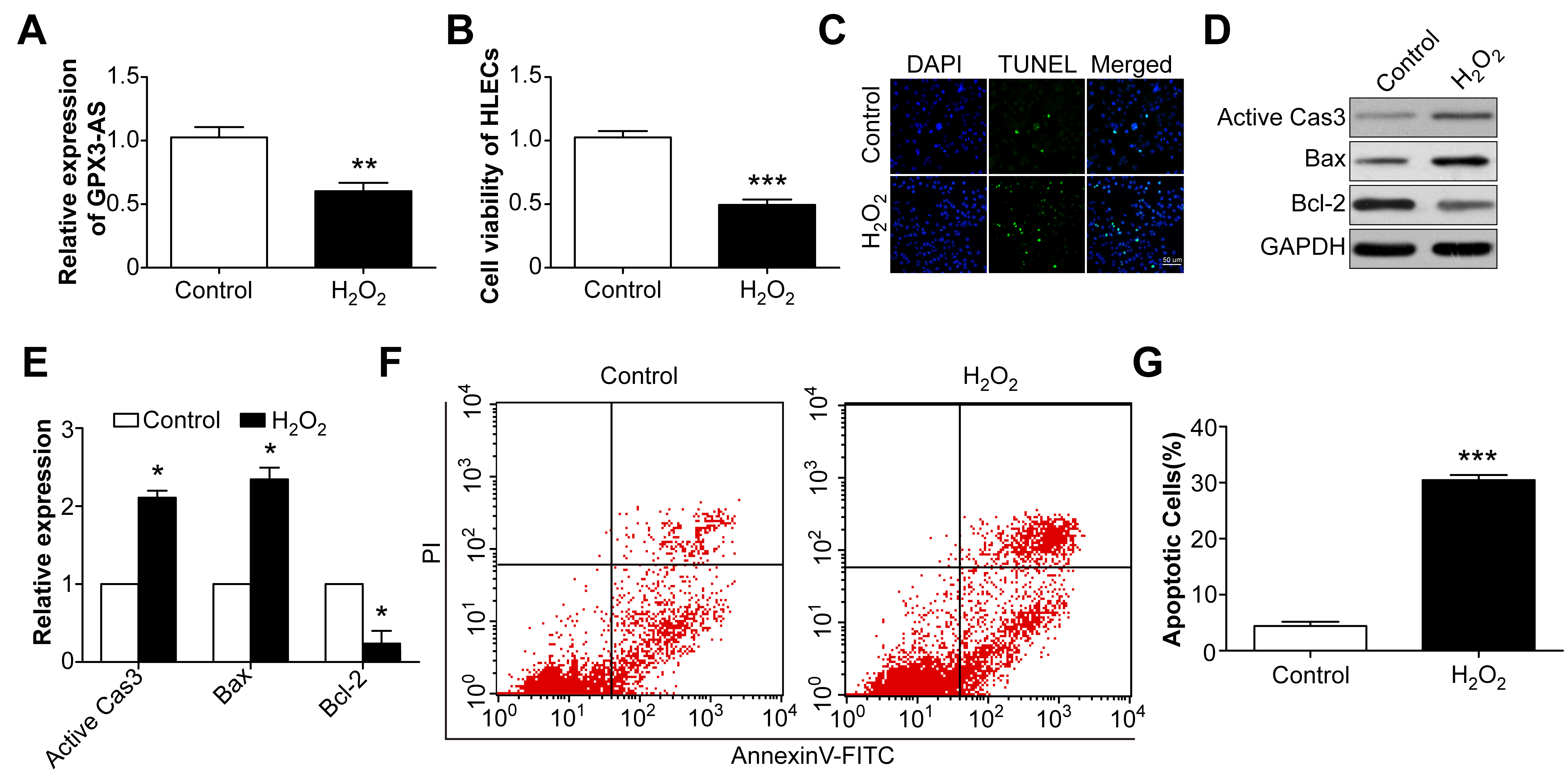 are induced by H2O2. A: SRA01/04 cells were treated with H2O2 for 24 h, and the GPX3-AS levels were detected by quantitative real-time PCR (qRT-PCR). **p<0.01 versus control group. B: Cell viability was detected by Cell Counting Kit-8 (CCK-8) assay. ***p<0.001 versus control group. C: TUNEL staining of SRA01/04 cells with or without H2O2 treatment. Scale bar = 50 μm. D, E: Active caspase-3, Bax, and Bcl-2 expression in SRA01/04 cells was detected by western blot. *p<0.05 versus each control